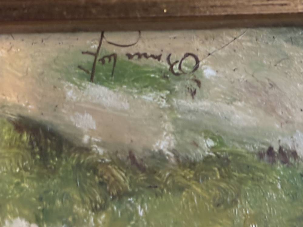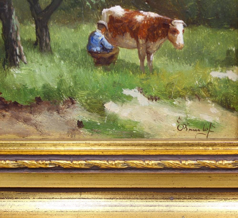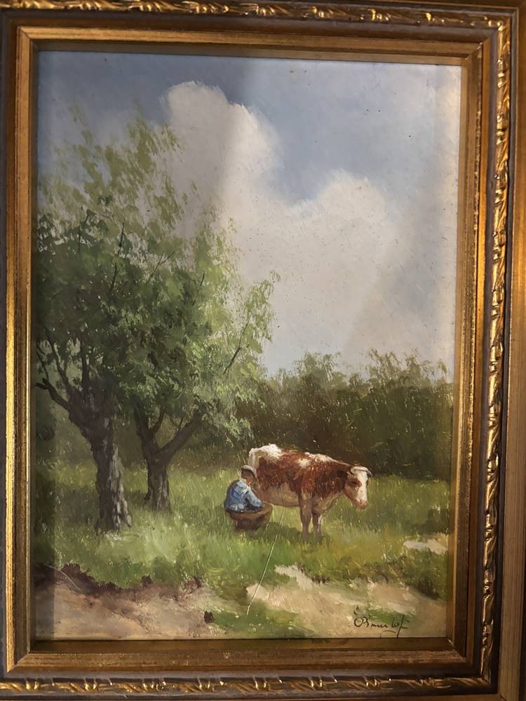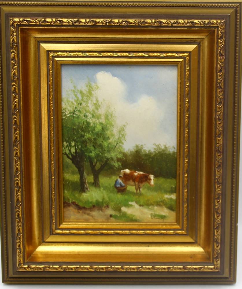 unleserl. signiert "Beim Kuhmelken" Öl/Holz, gut gerahmt, RG 26x31 cm [1]
