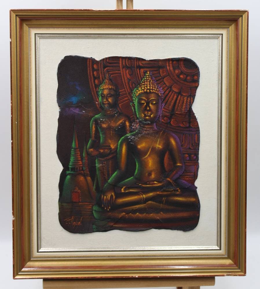 unleserl. signiert, Buddhas, Öl/Hartfaser, wohl Thailand, leicht restau.bedürftig, gerahmt, RG 44 x 38,5cm [1]