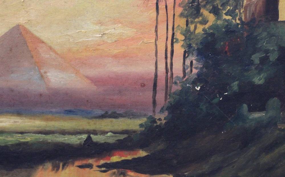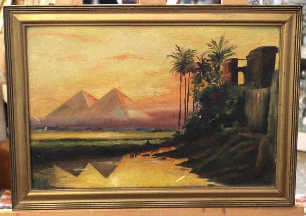 unleserl.signiert, Pyramiden von Gizeh, älter, Öl/Malkarton, restau.bedürftig, gerahmt, RG 36 x 51cm [1]
