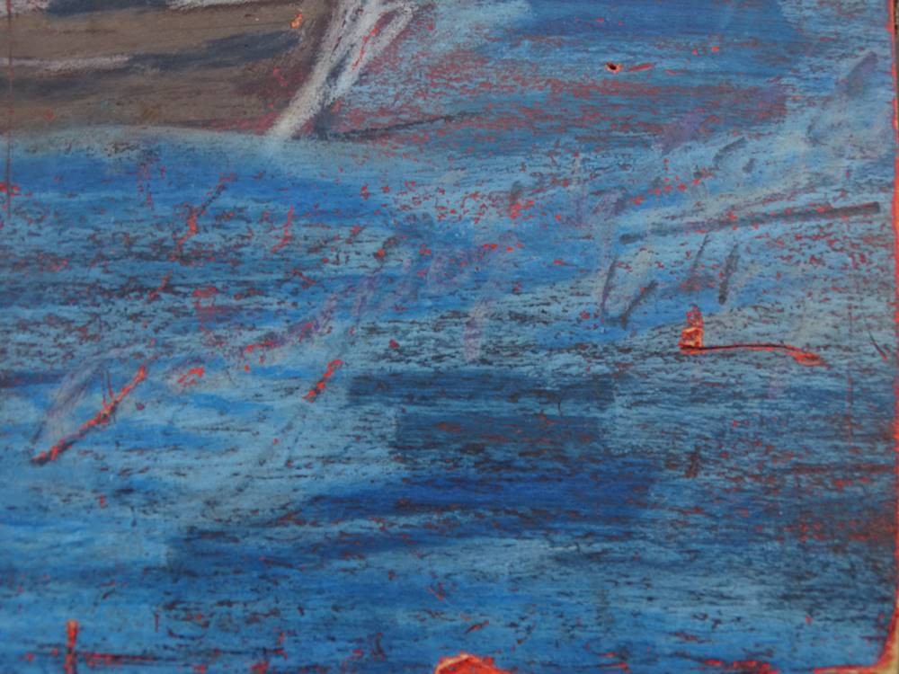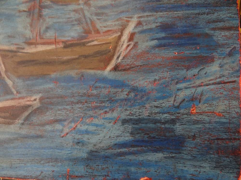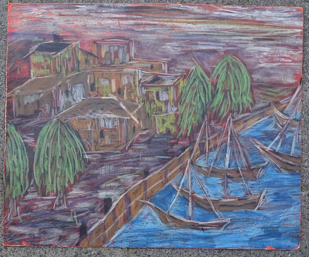 unleserl. signierte Gemälde "Boote am Ufer" wohl Südsee, Mischtechnik auf Pappe, 38x47 cm, verso beschriftet [1]