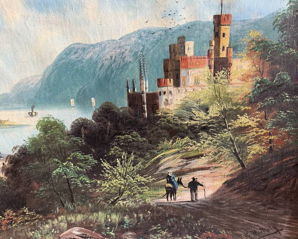 unleserl. signierte Landschaft am Fluss, Öl/Leinen, gut gerahmt, RG 70x87 cm, wohl Sperrgut [1]