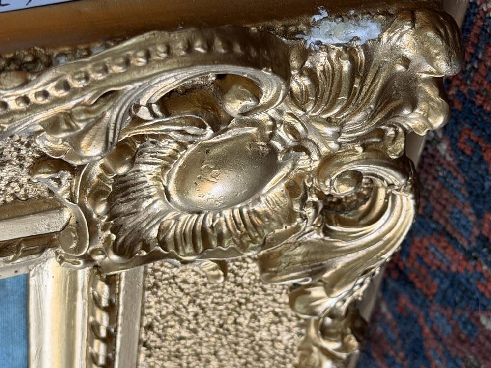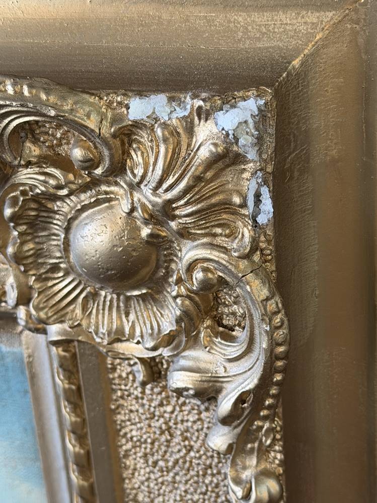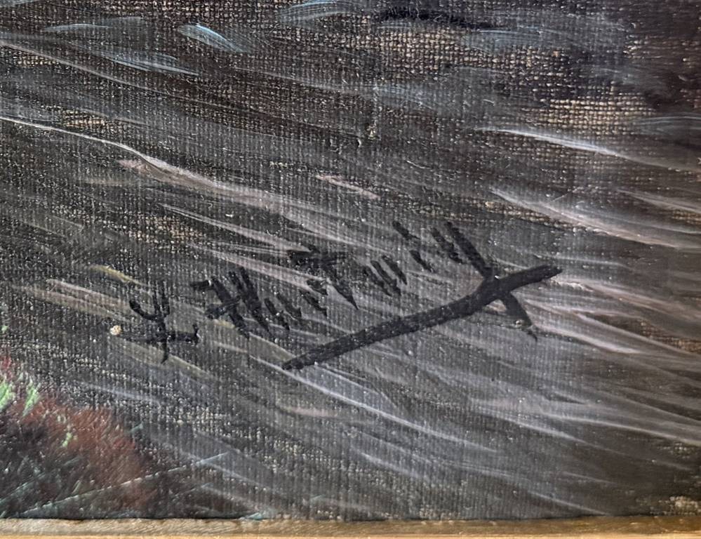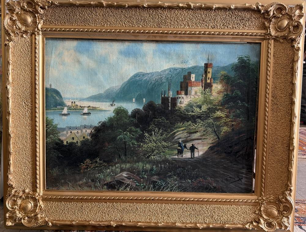 unleserl. signierte Landschaft am Fluss, Öl/Leinen, gut gerahmt,mit kl. Abplatzern oben , RG 70x87 cm, Sperrgut [1]