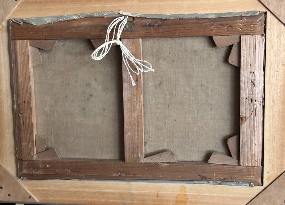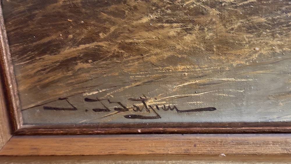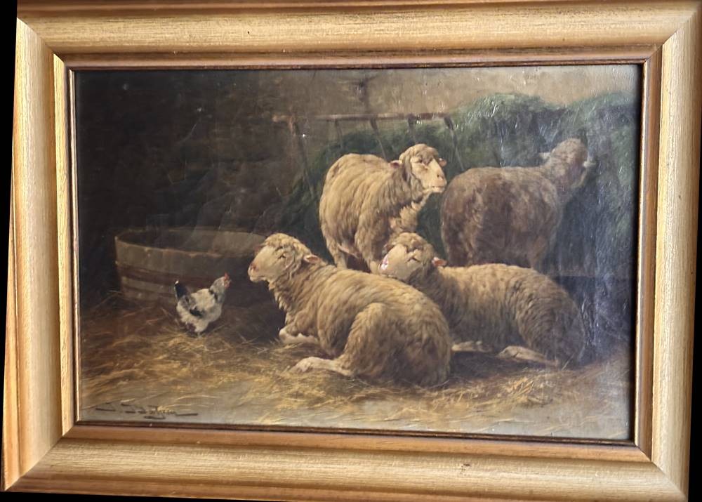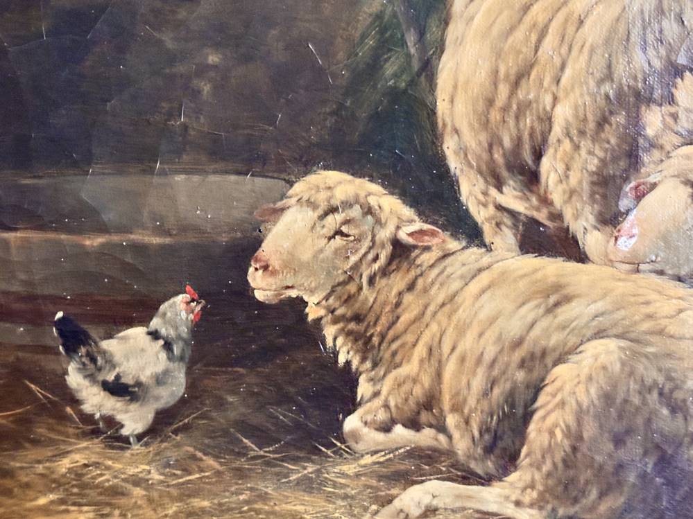 unleserl. signierter Altmeister "Schafe im Stall mit Huhn" um 1860, Öl/Leinen, gerahmt, leicht craquelliert, RG 38x53 cm [1]