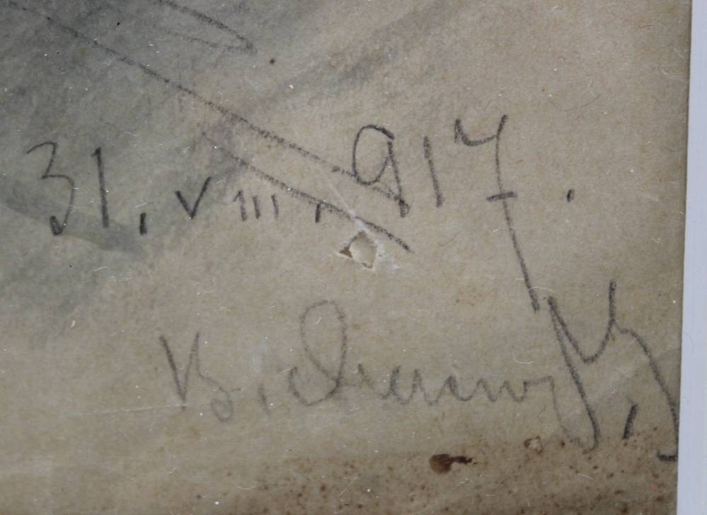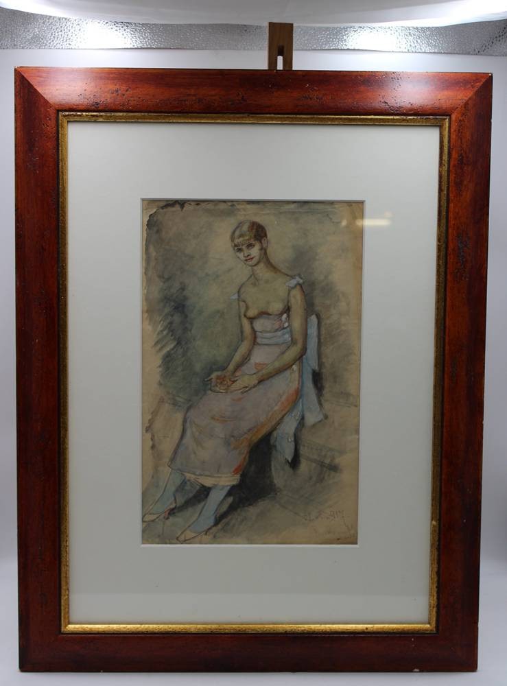 unleserl. signiertes Aquarell von 1917, weibl. sitzender Halbakt, gerahmt/Glas, RG 70,5 x 54cm, Blatt mit Läsuren [1]