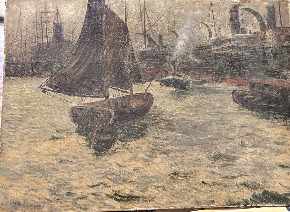 unleserlich re. unten in Farbe signierte Hafenszene, Öl/Pappe , 34x44 cm [1]