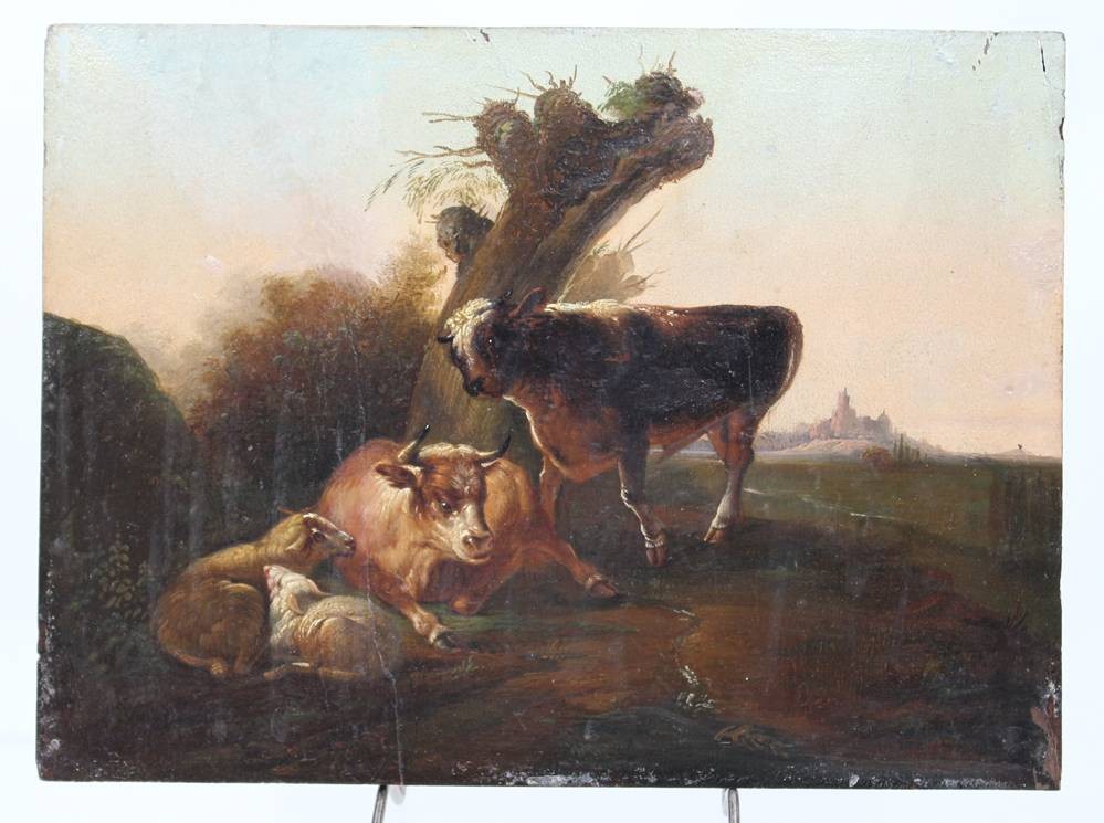 unsigniert, Kühe und Schafe, verso Etikett "Verhoesen", wohl Albertus VERHOESEN (1806-1881) zugesch. , Öl/Holz, ungerahmt, 20 x 27cm [1]