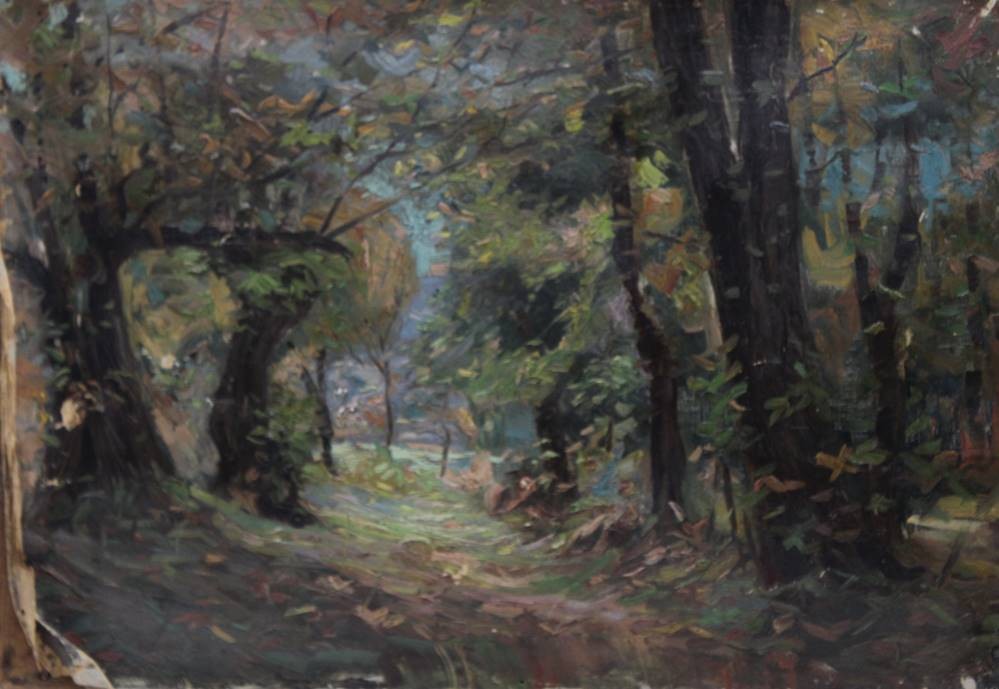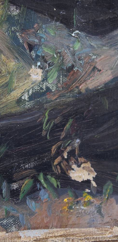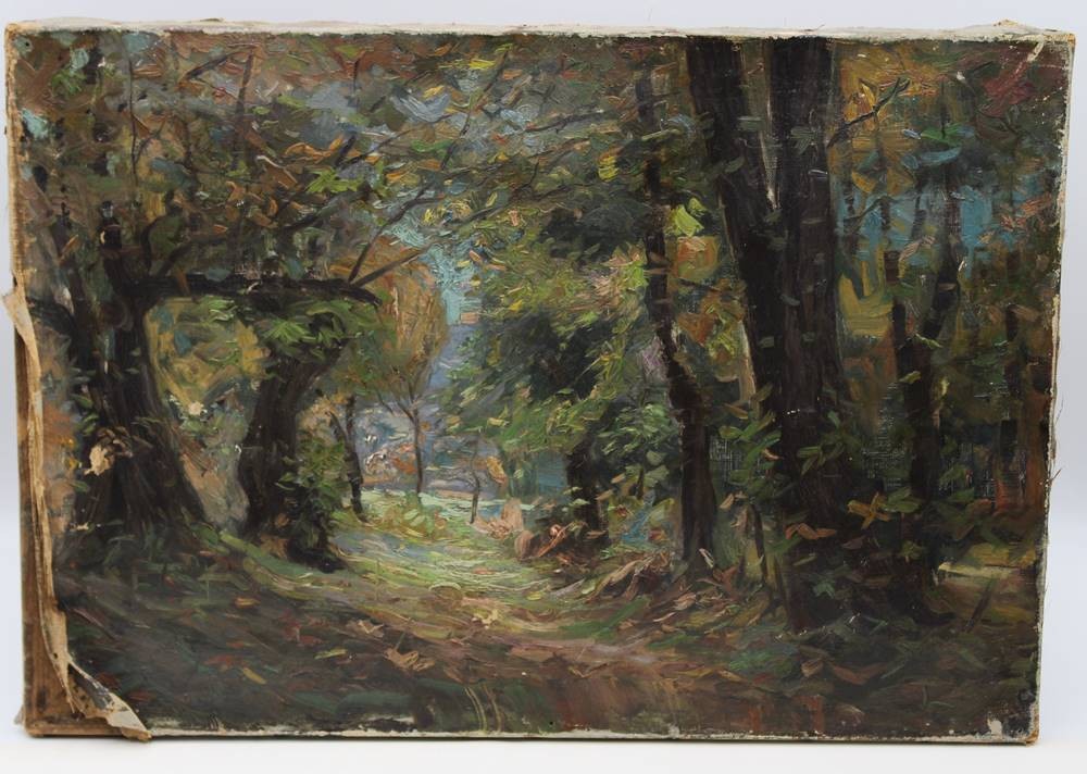 unsignierter Laubwald, älter, Öl/Leinwand, stark restau.bedürftig, ungerahmt, 38 x 55cm [1]