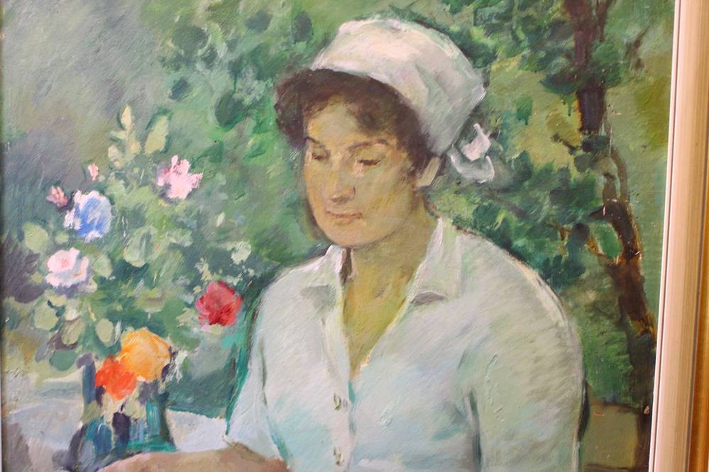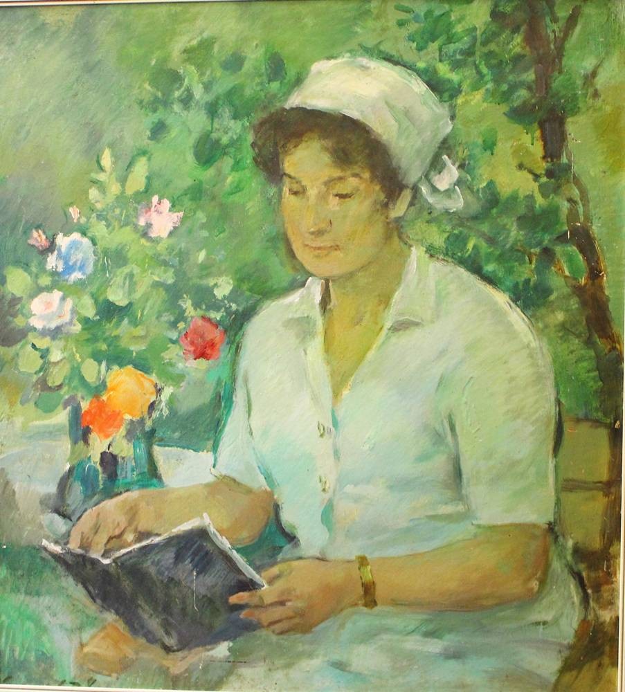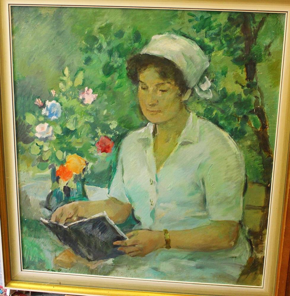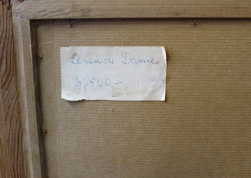 unter Rahmen signiert "Lesende Dame" verso Etikett "Prof. O.???? 1885-1972, leider Stempel verblichen, Öl/Malfaser, gerahmt, RG 85x79 cm, /Sperrgut) [1]