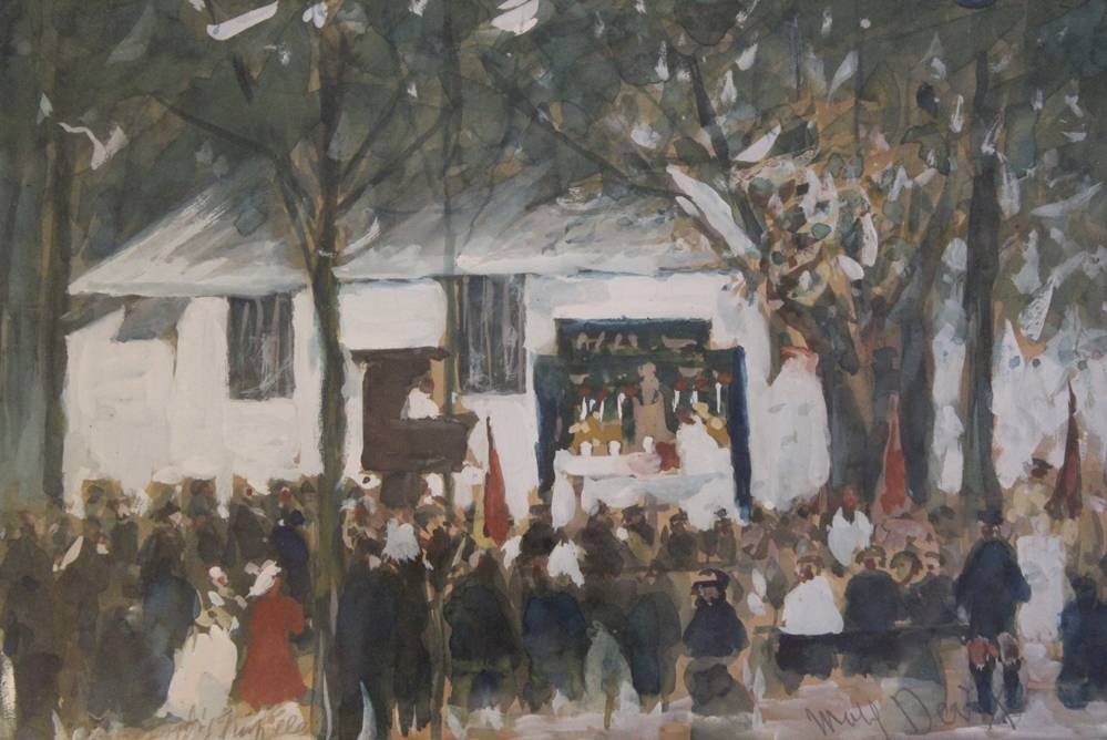 Wolf De...X, Gottesdienst im Freien, unleserl. betitelt, Aquarell, ger./Glas, Rahmen mit Schäden, RG 54,5 x 70,5cm