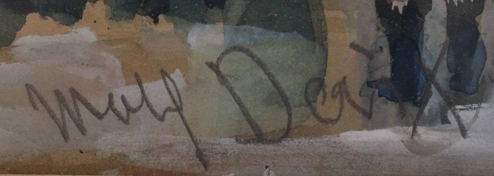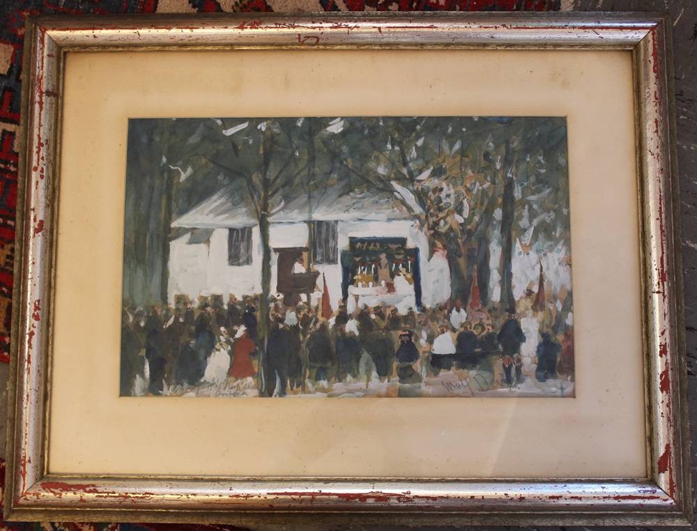 Wolf De...X, Gottesdienst im Freien, unleserl. betitelt, Aquarell, ger./Glas, Rahmen mit Schäden, RG 54,5 x 70,5cm [1]