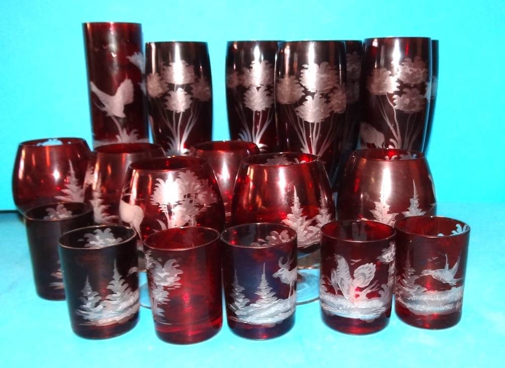 19x Rubinglas-Gläser mit Wilddekor-Schliff etc., 6x Sekt-6x Cognac, 6x Schnaps- und ein Bierglas, H-5,5 bis 16 cm [1]