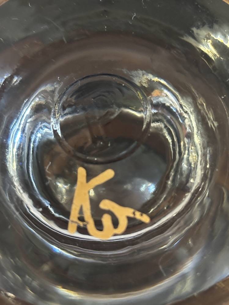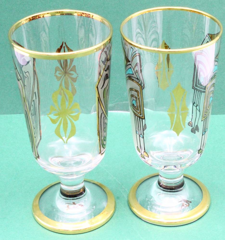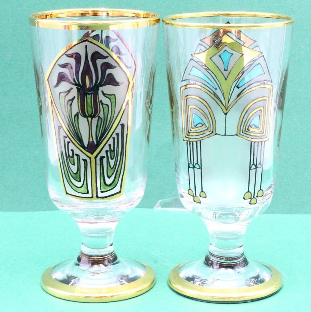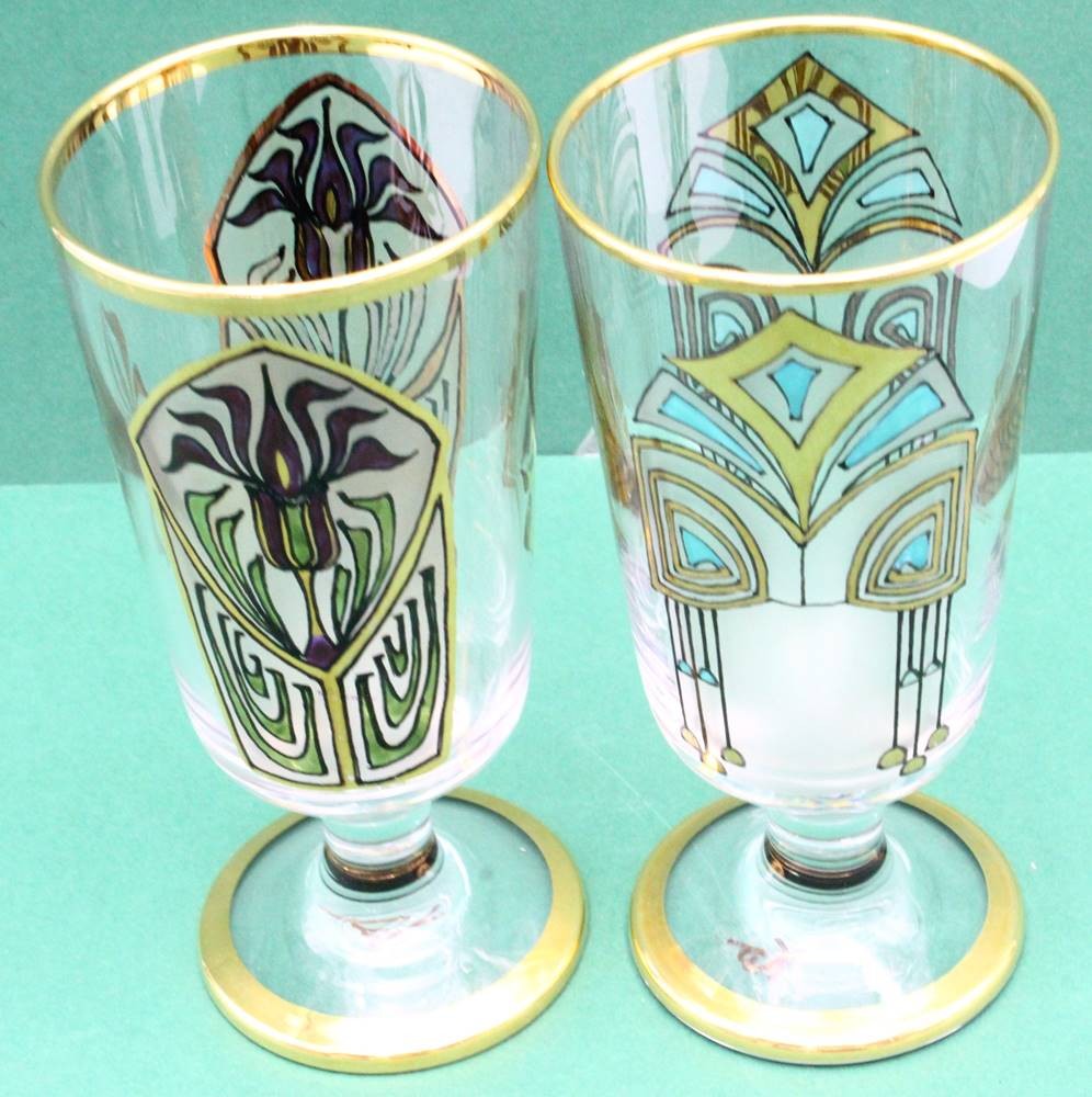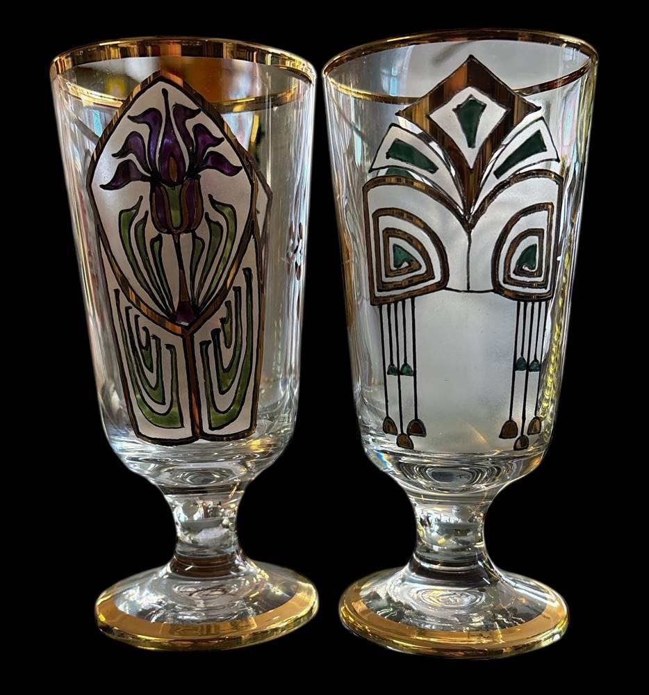 2 Art Deco Pokalgläser auf Stand, handbemalt und signiert, H- je 15,5 cm, beide gut erhalten [1]