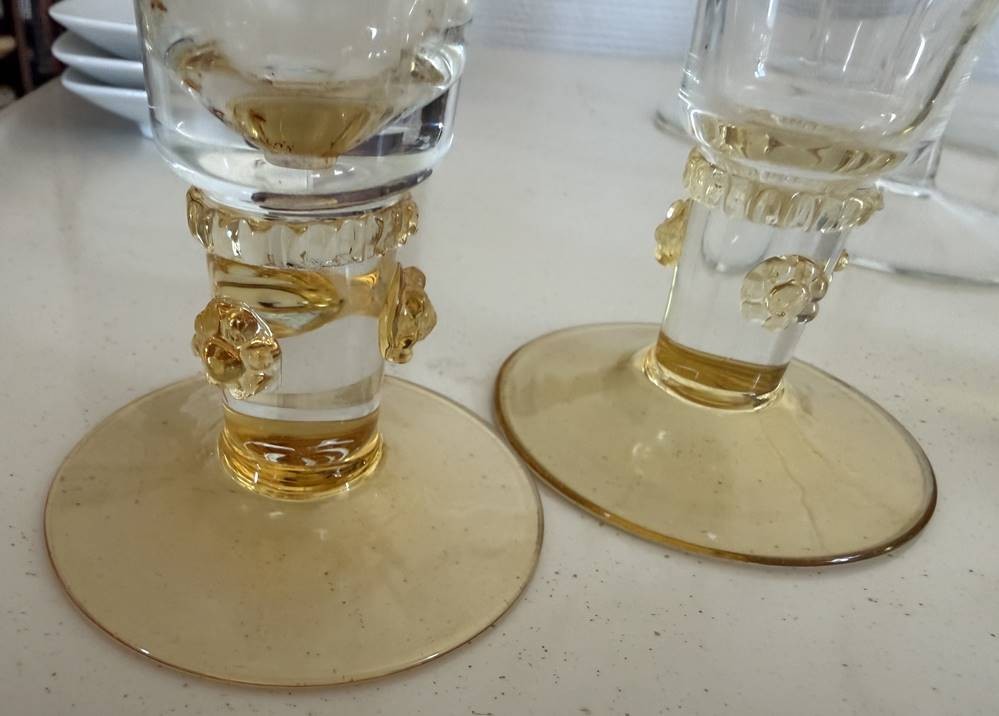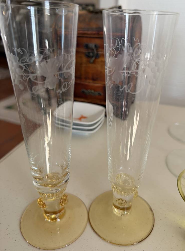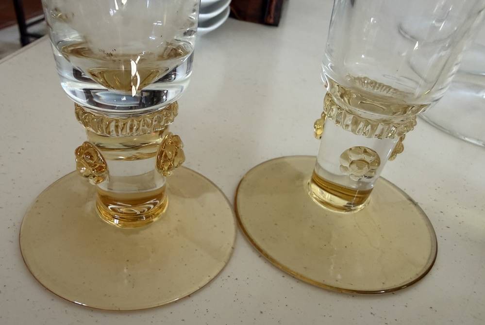 2 hohe Sektflöten, Weinlaubschliff, bernsteinfarbener Stand mit Noppen, H-19 cm [1]