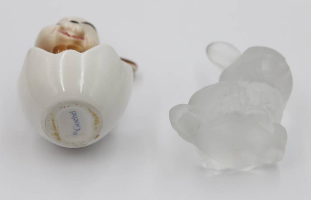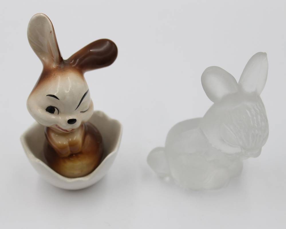 2x div. Hasenfiguren von Goebel, Glas u. Keramik, ca. H-9,5cm [1]