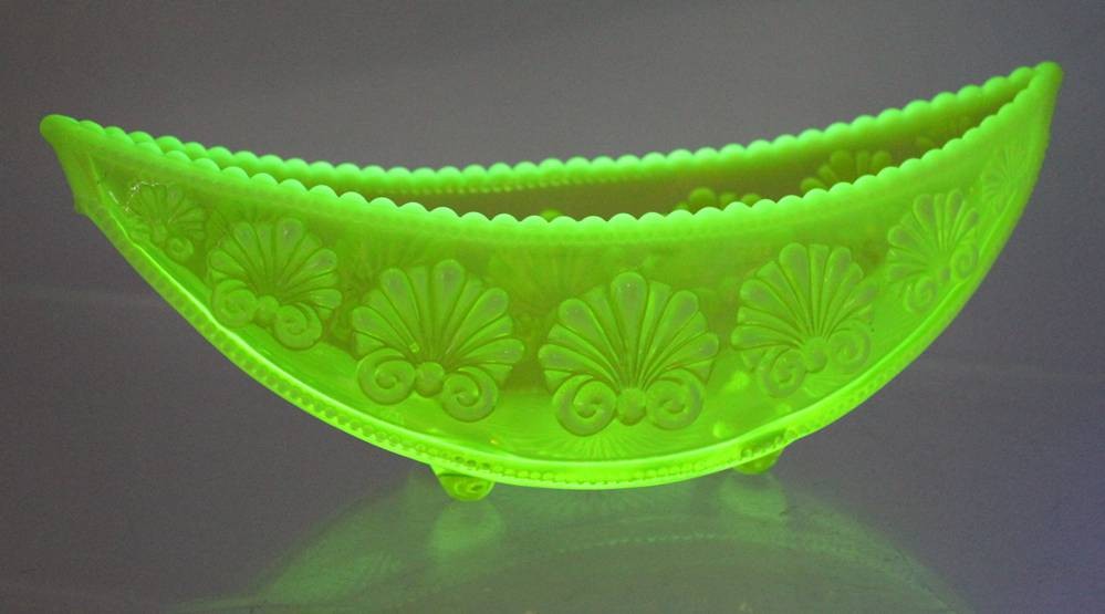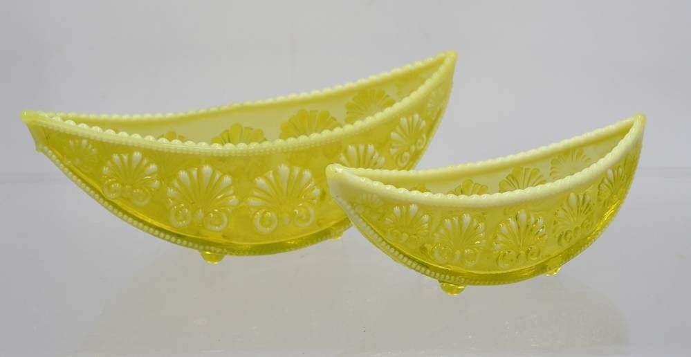 2x Schiffchen, älter, Uranglas, ca. H-7,5cm 19,5cm, und H-6cm L-15cm [1]