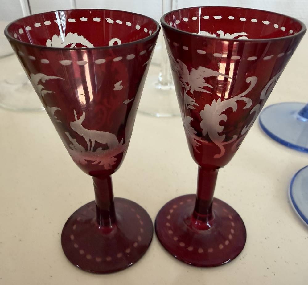 2x Schnapsgläser, Rubinglas mit Barockschliff, Böhmen, H-9 cm [1]