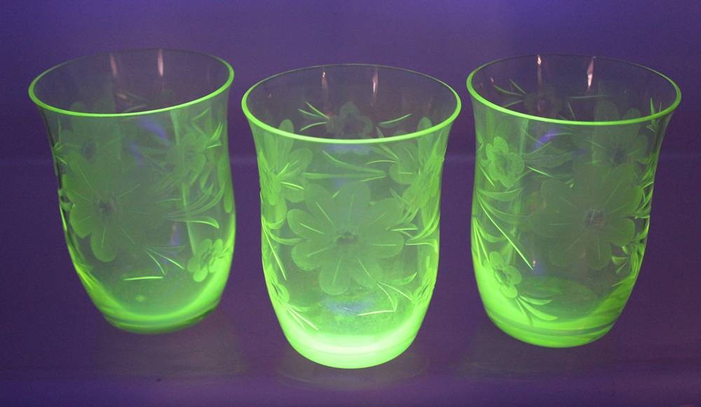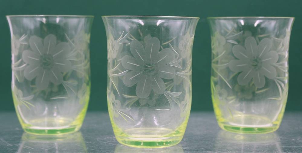 3x Gläser, Uranglas, älter, floral beschliffen, ca. H-9,8cm [1]