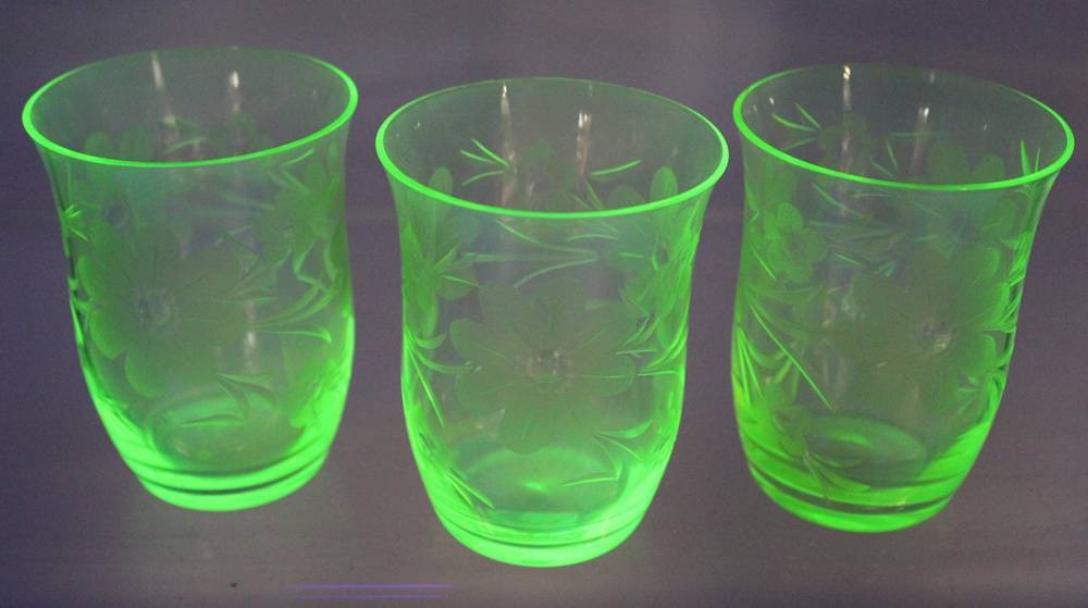 3x Gläser, Uranglas, älter, floral beschliffen, ca. H-9,8cm