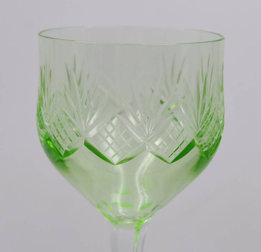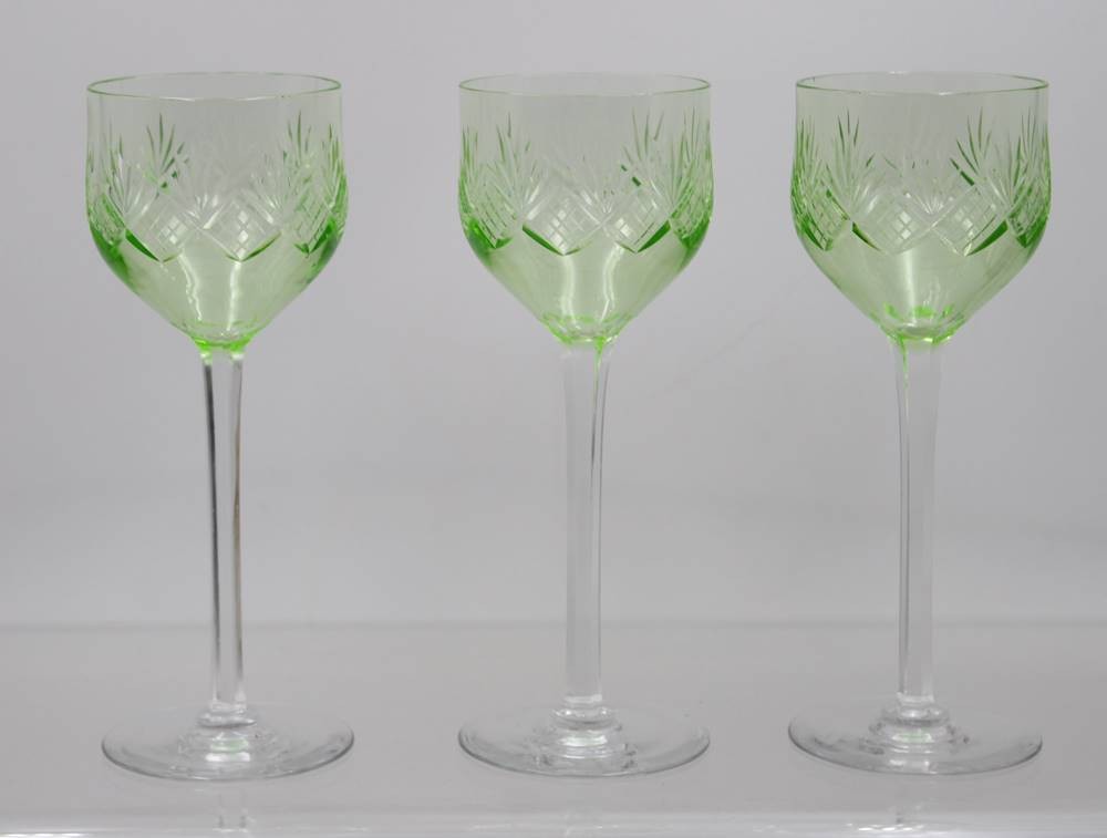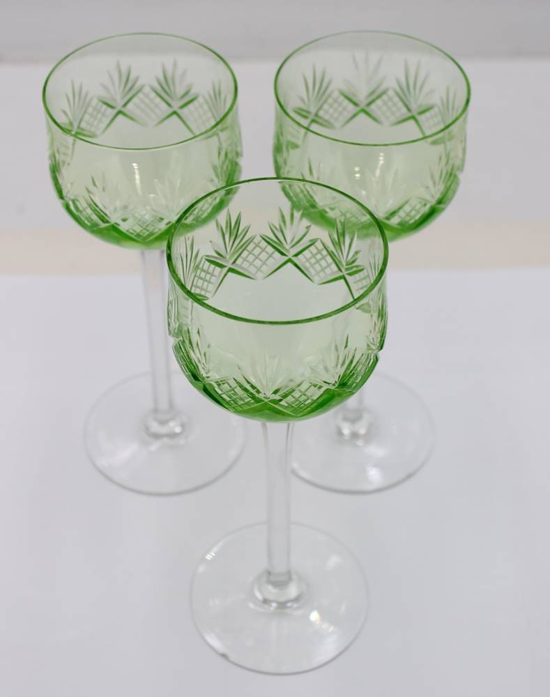 3x Weingläser, älter, Kuppa aus Uranglas, 1x an Stand Chip, ca. H-18,5cm