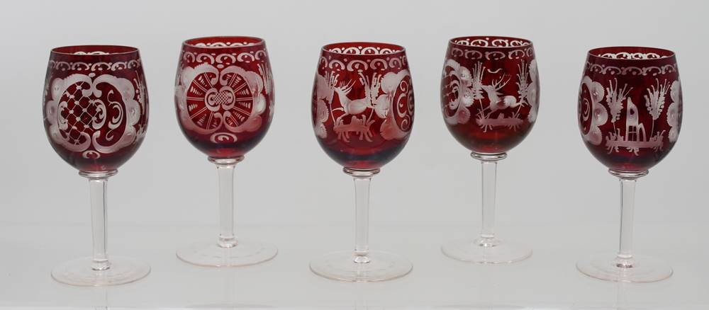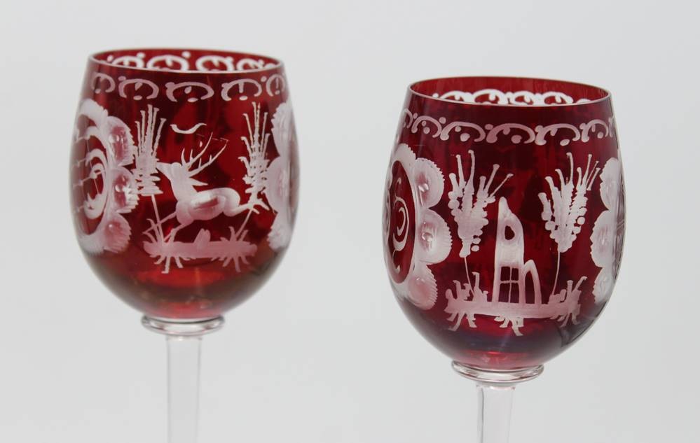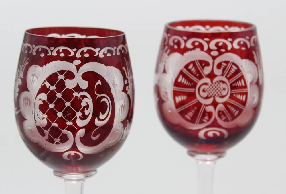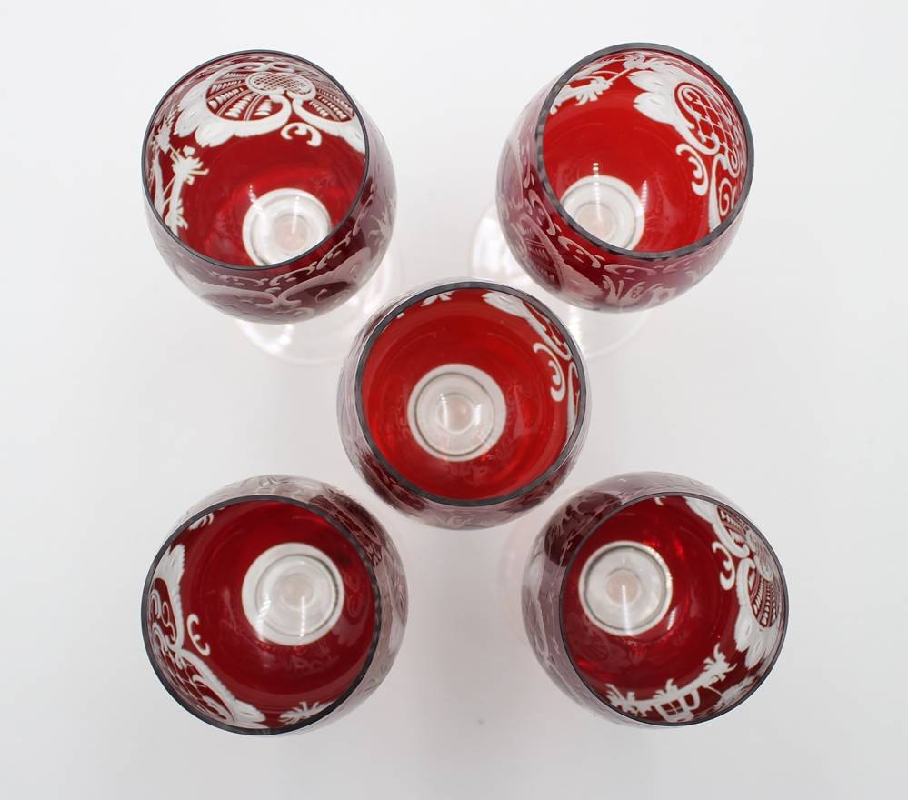 5x Weingläser, rot überfangen, Barockschliff, ca. H-14,5cm