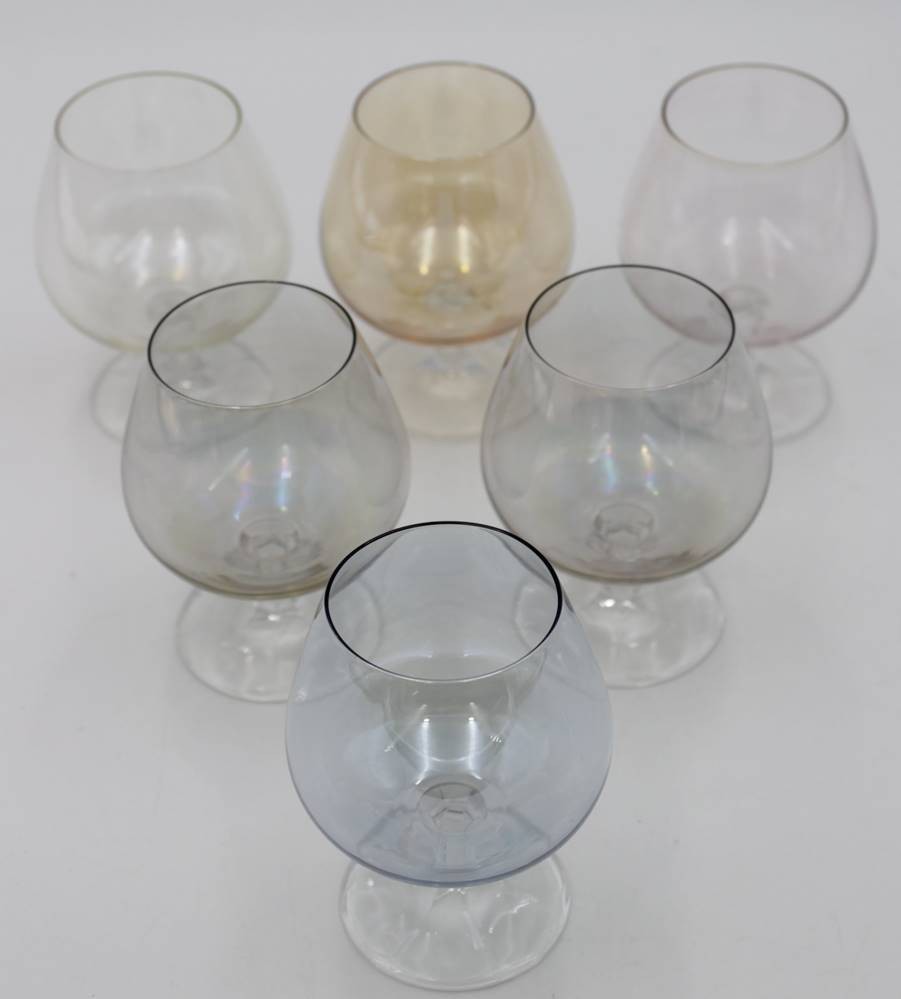 6x Cognac-Schwenker, Buntglas, leicht lüstrierend, ca. H-9,5cm.