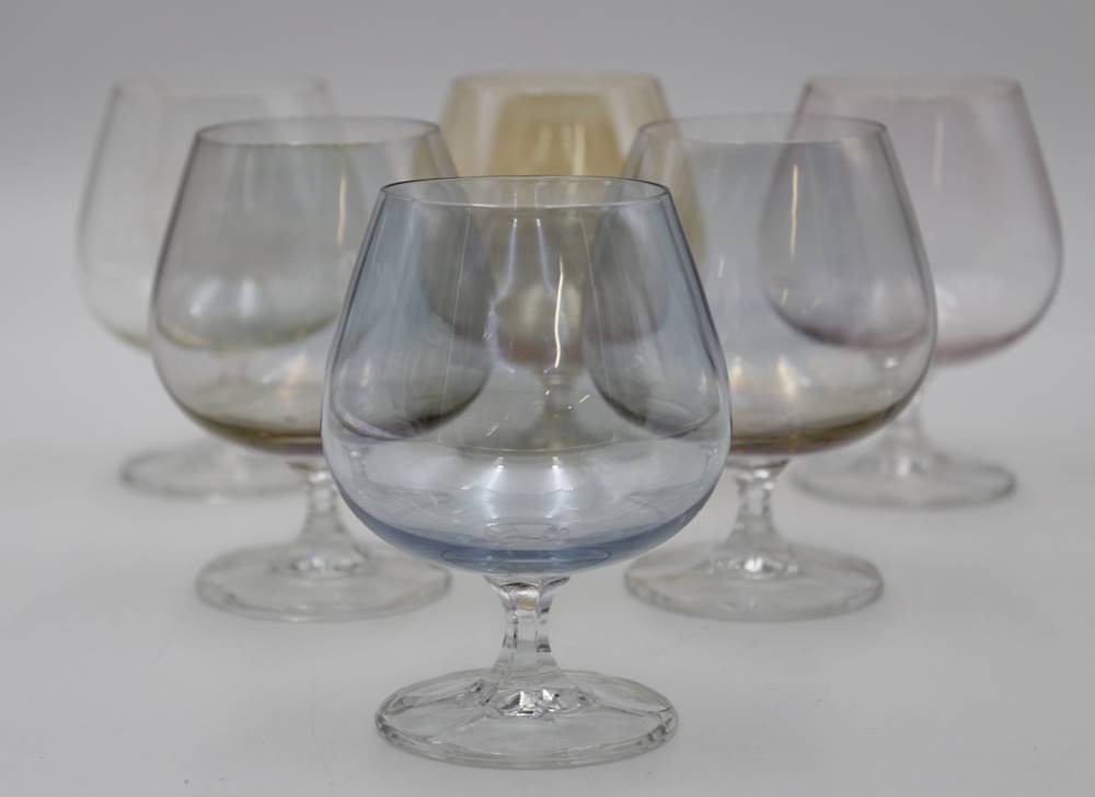 6x Cognac-Schwenker, Buntglas, leicht lüstrierend, ca. H-9,5cm. [1]