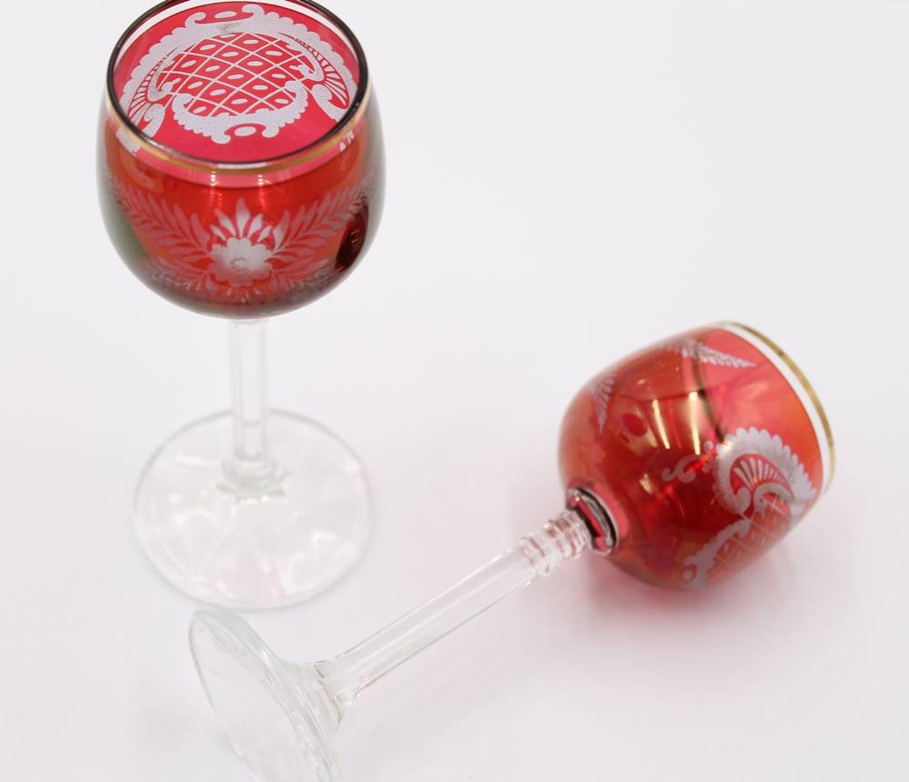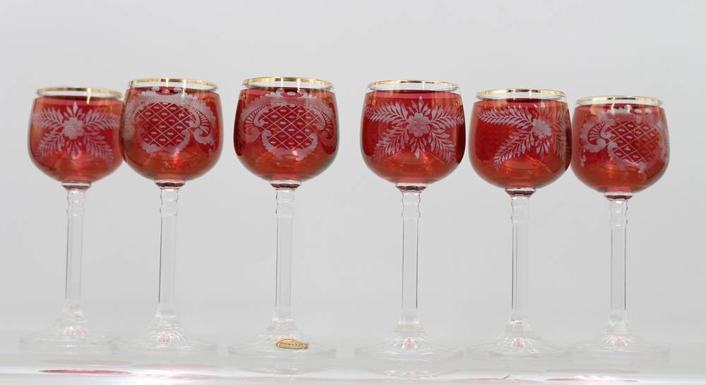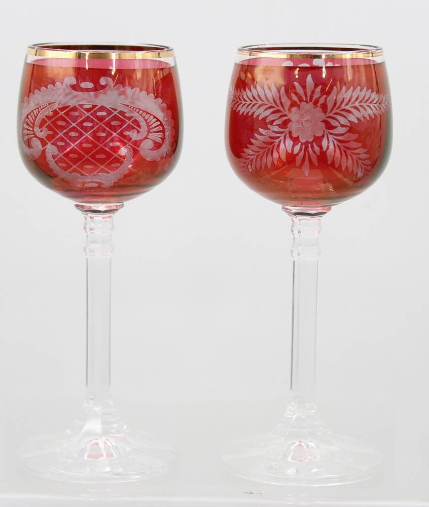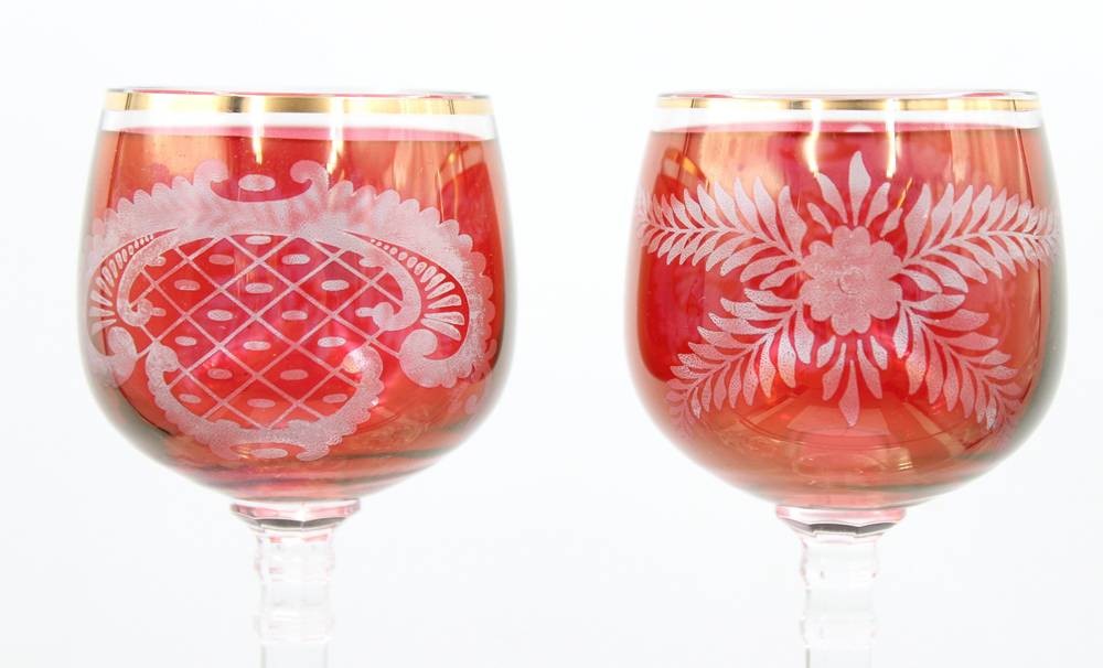6x Likörgläser, Ätzdekor und rot gebeizt, Bohemia, ca. H-13,5cm [1]