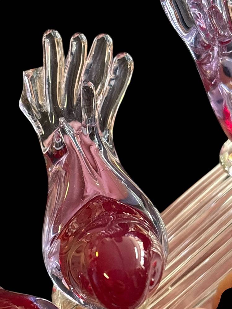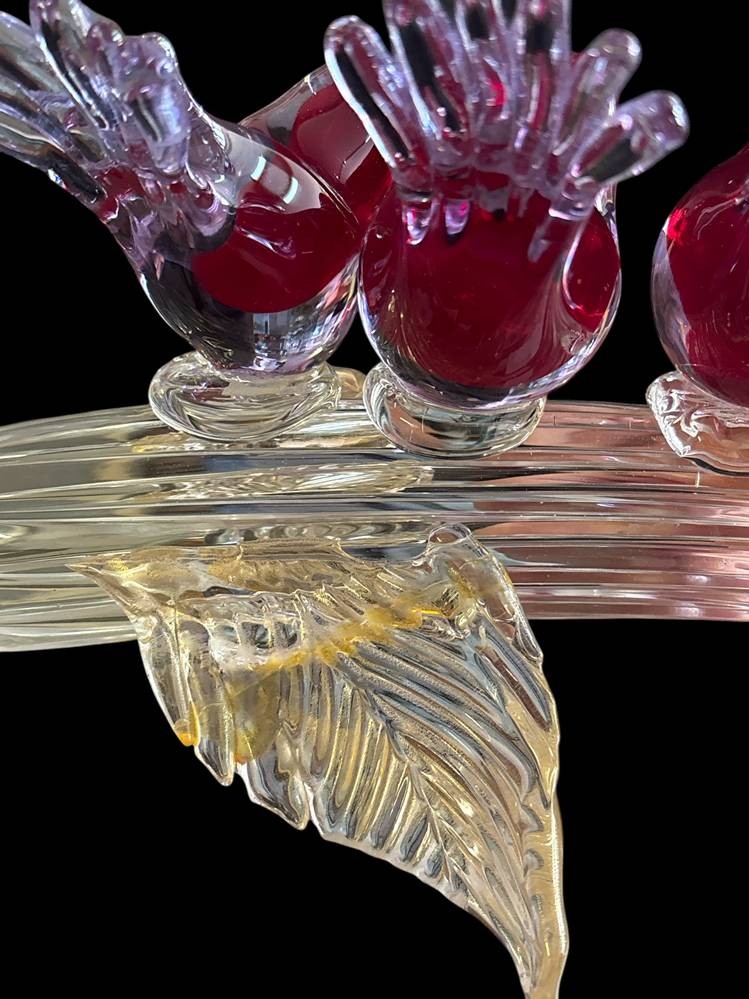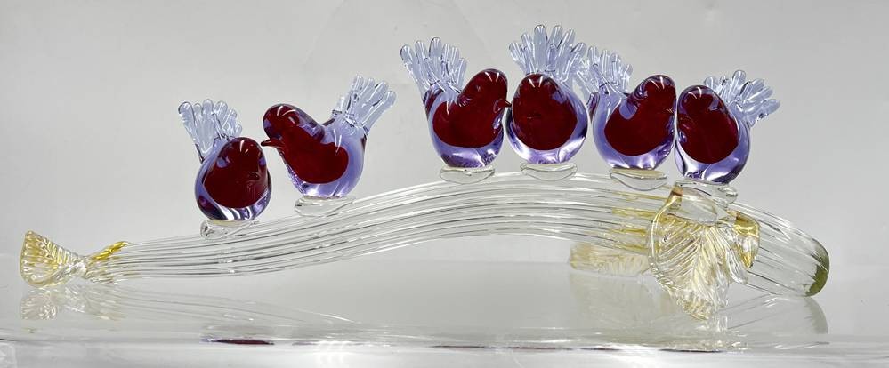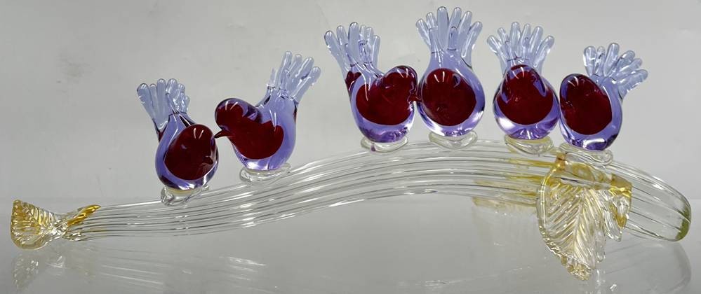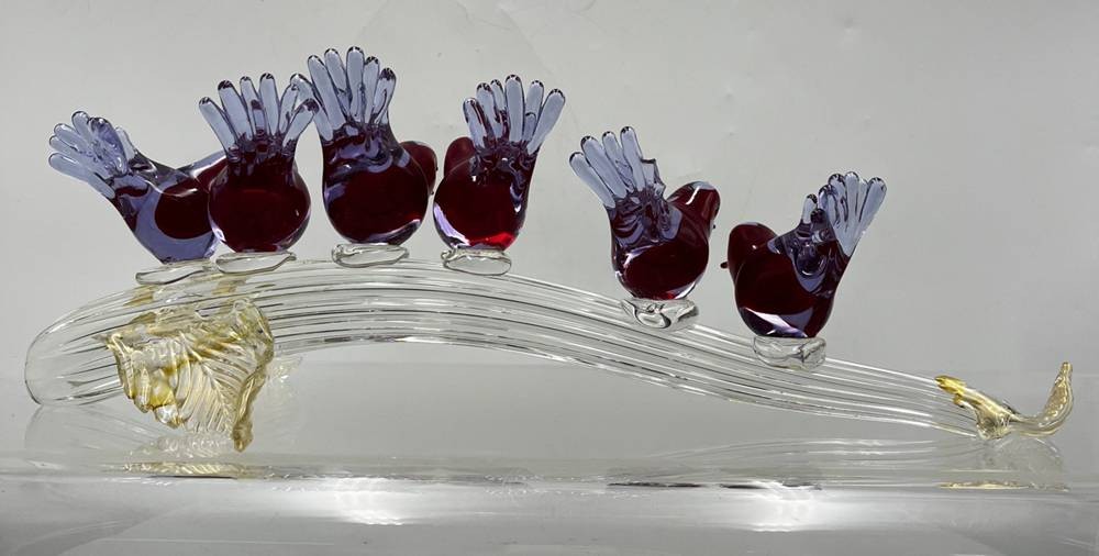 6x Vögel auf Ast, Murano, 1x Schwanzfedern bestossen, Blatt geklebt, L-42 cm, T-18 cm, H-13 cm [1]