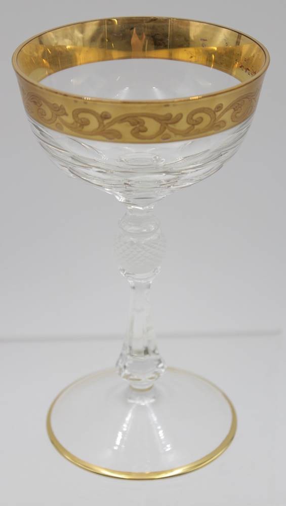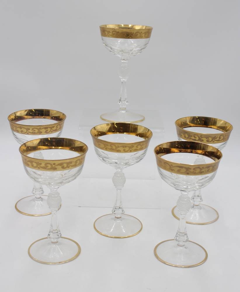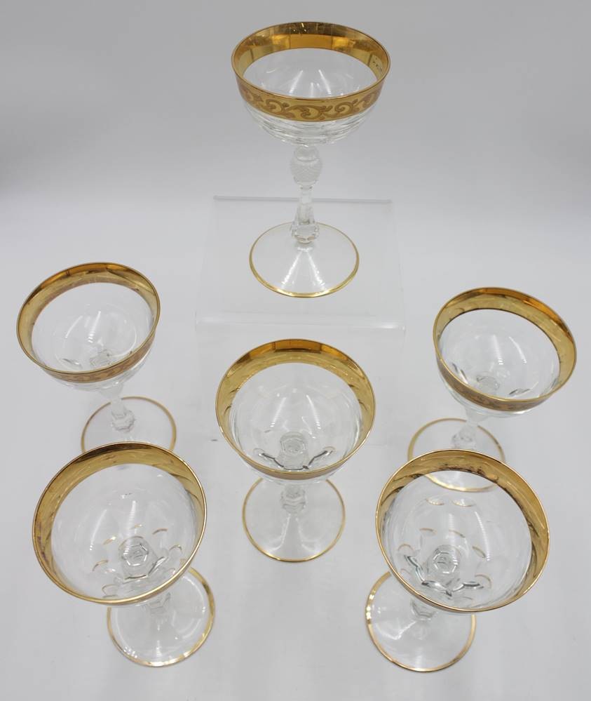 6x Weingläser, Kristall, verzierter Goldrand, gute Erhaltung, je ca. H-17cm. [1]