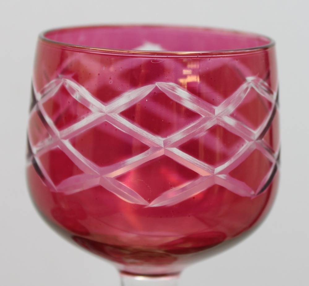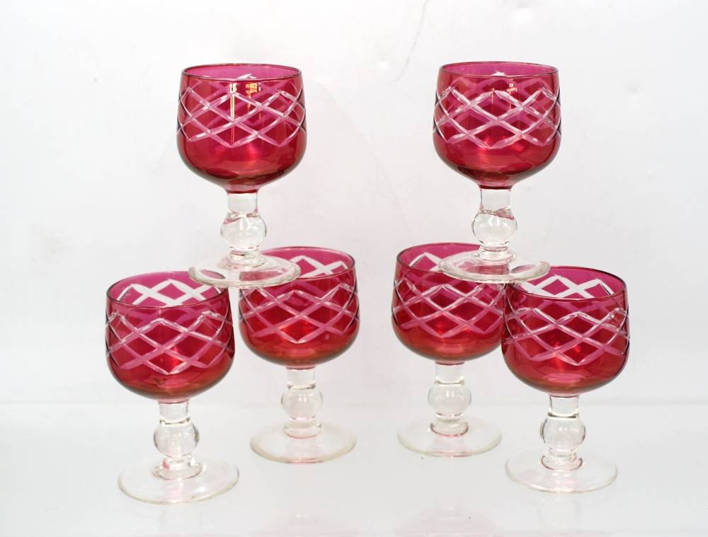 6x Weingläser, rot gebeizt, beschliffen, älter, ca. H-11,5cm