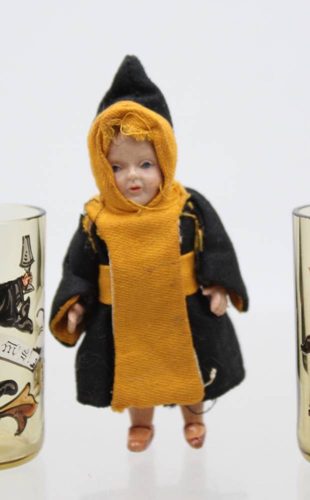 8x Schnapsgläser mit Emaillemalerei sowie kl. Puppe, Münchner Kindl, älter, ca. H-5cm Puppe H-8cm [1]