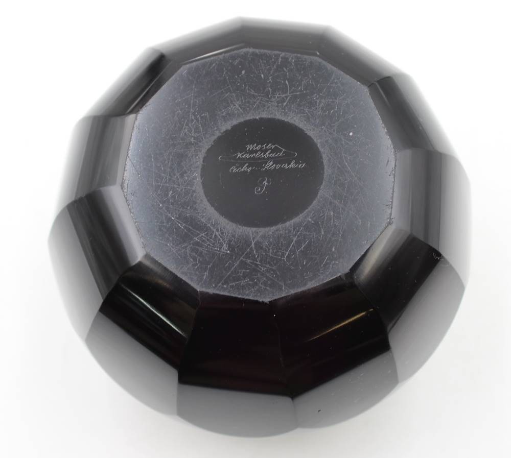 Art Deco-Vase, Moser, Amethystglas, facettetierte Kugelform, figürlich geätzter Fries mit Figuren, vergoldet (l. berieben), Boden sign. Moser Karlsbad Cecho Slovakia, 20er/30er Jahre, ca. H-11,5cm ca. D-14cm [1]
