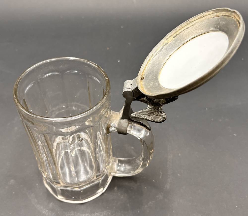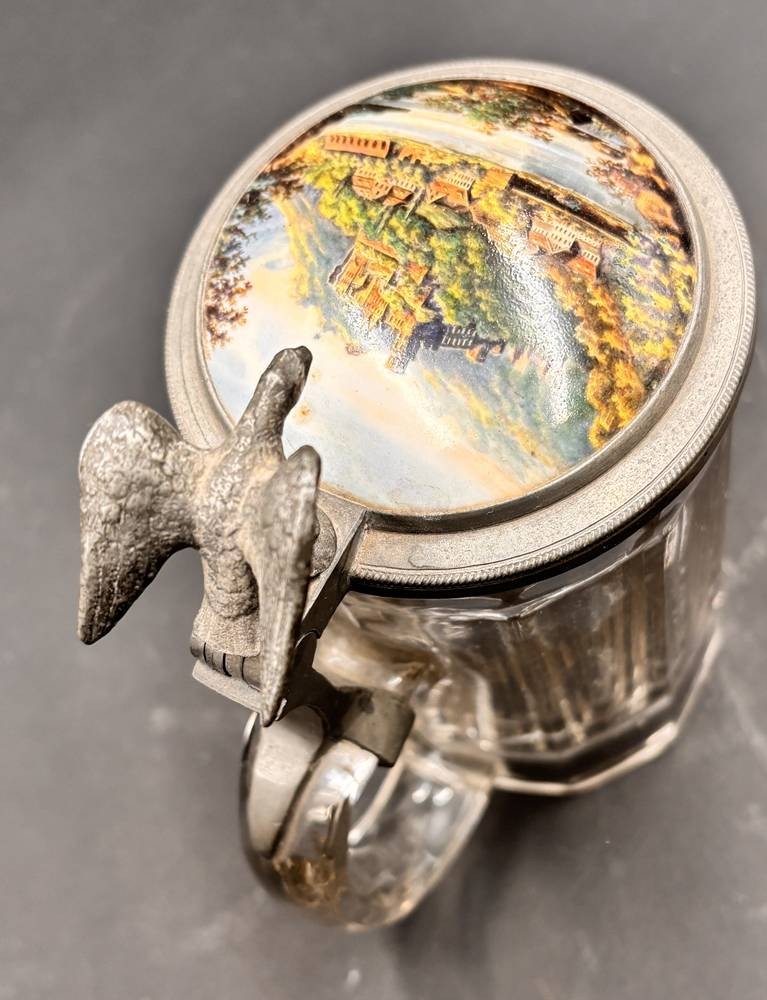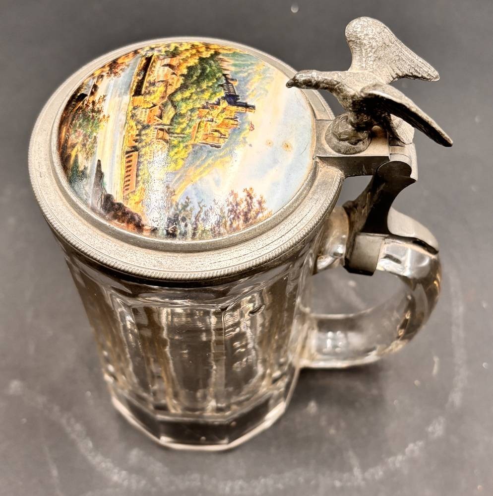 Bierkrug mit Porzellandeckel, bemalt mit Schloss Heidelberg, Adler als Daumenraster, H-17 cm [1]