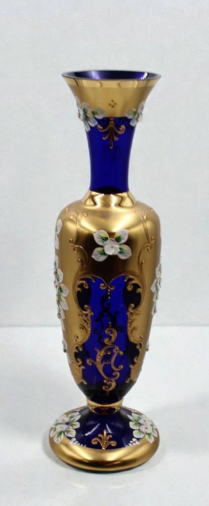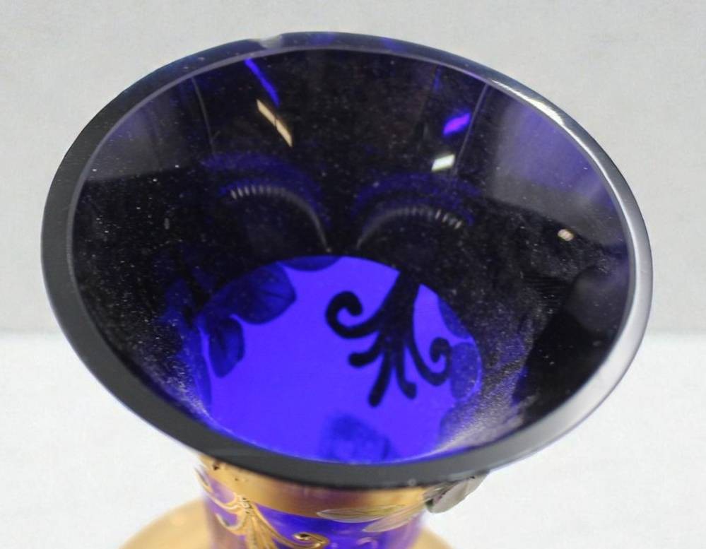 blaue Vase mit aufwendiger Emaillemalerei, wohl Böhmen, oberer Rand mit Chip, ca. H-31,5cm [1]