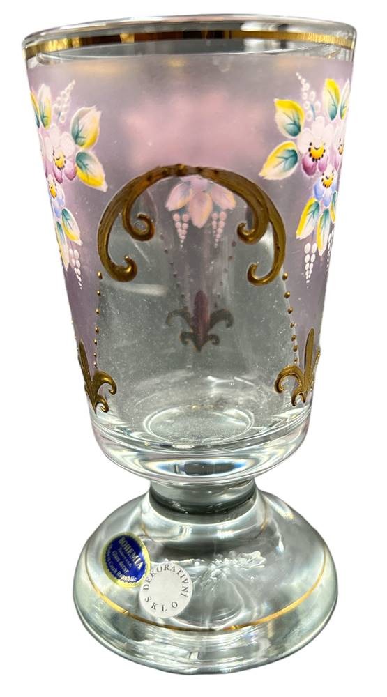 böhmischer Fussbecher mit Emaille-Malerei, H-15 cm, Etikett [1]