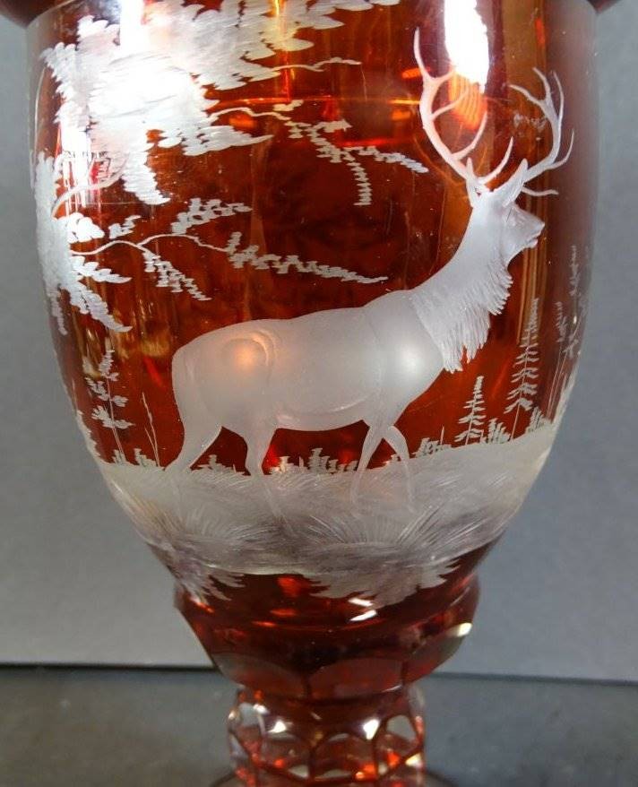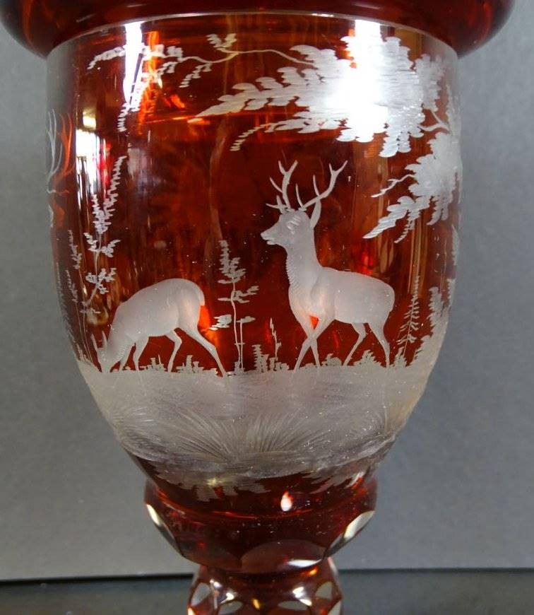 böhmischer Rubinglas-Pokal, um 1850 überfangen und mit Wild-Szenen beschliffen, H-28 cm [1]