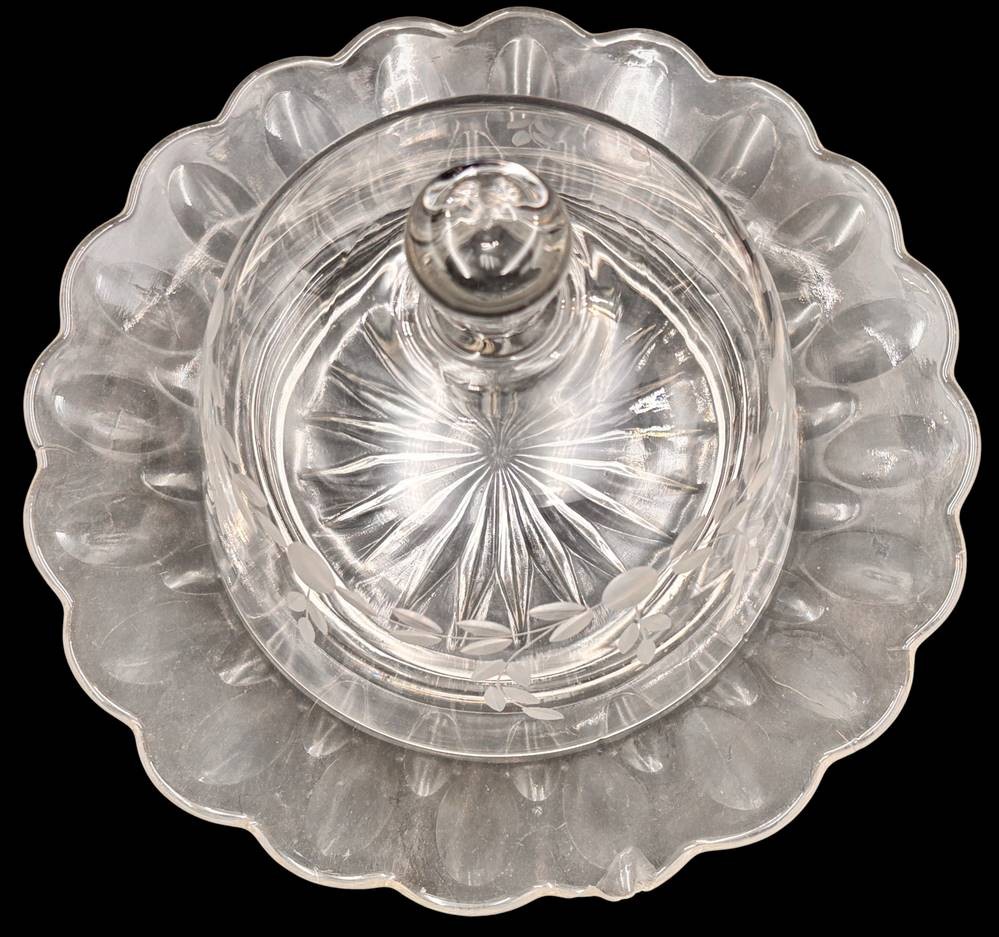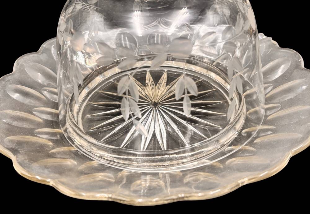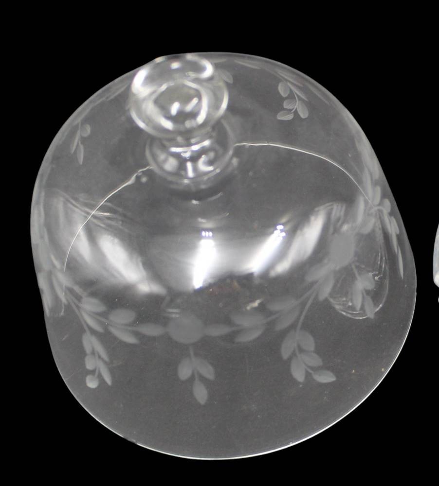 Butter- bzw. Käseglocke, Deckel mit floralen Schliff, H-12 cm, D-21 cm, Teller mit Chip [1]