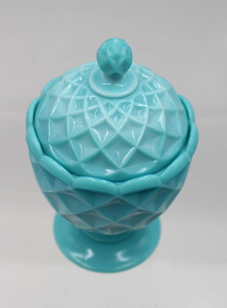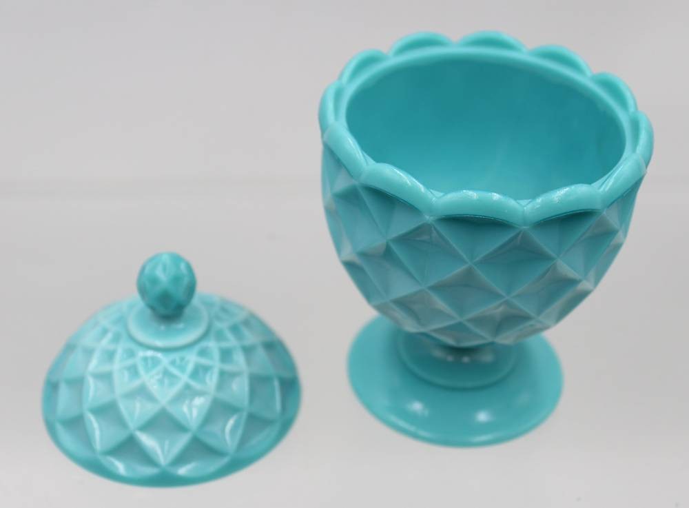 Deckeldose auf Stand, opalines Glas, älter, H-14,5cm [1]
