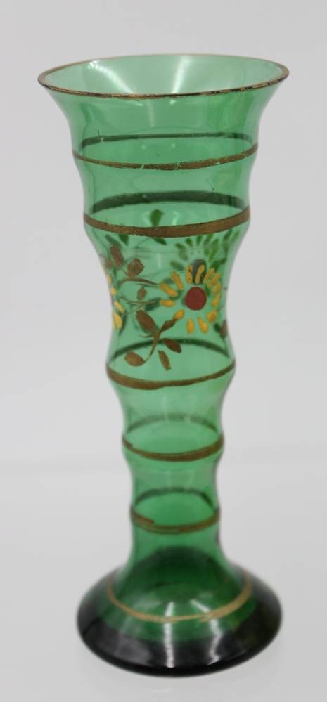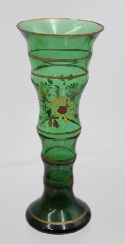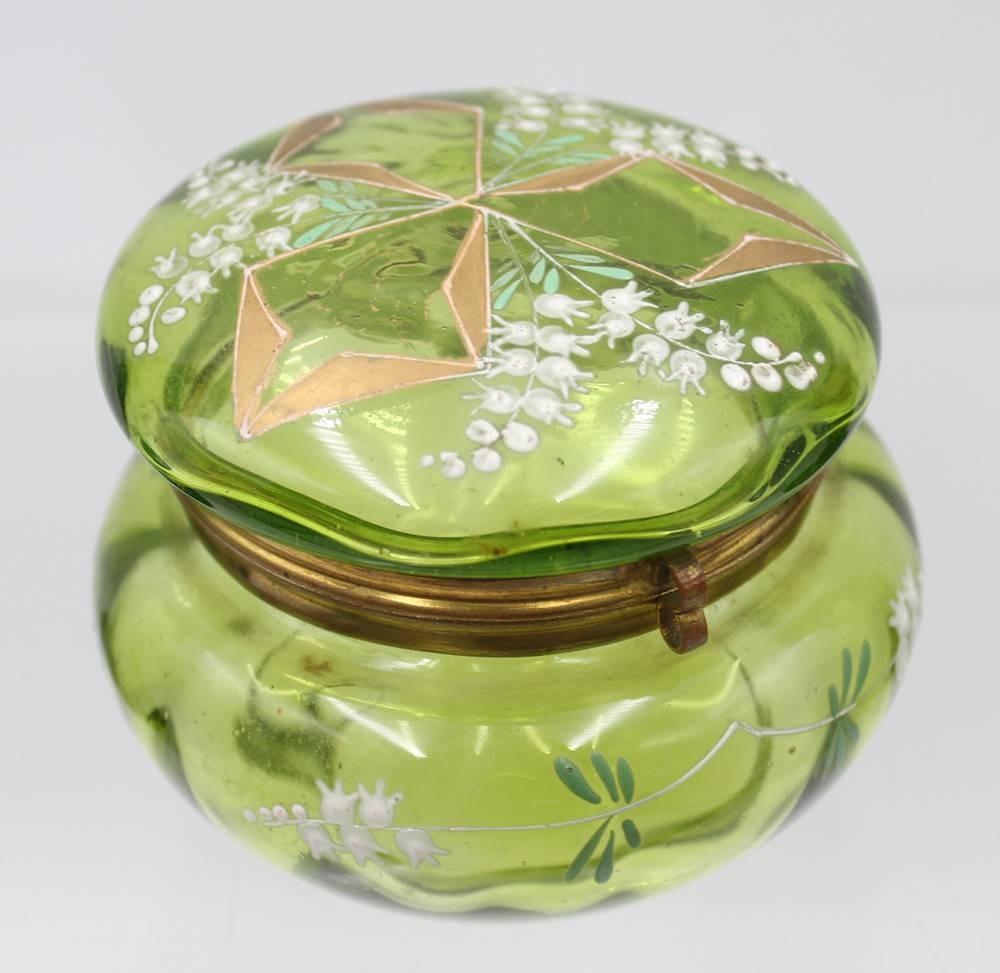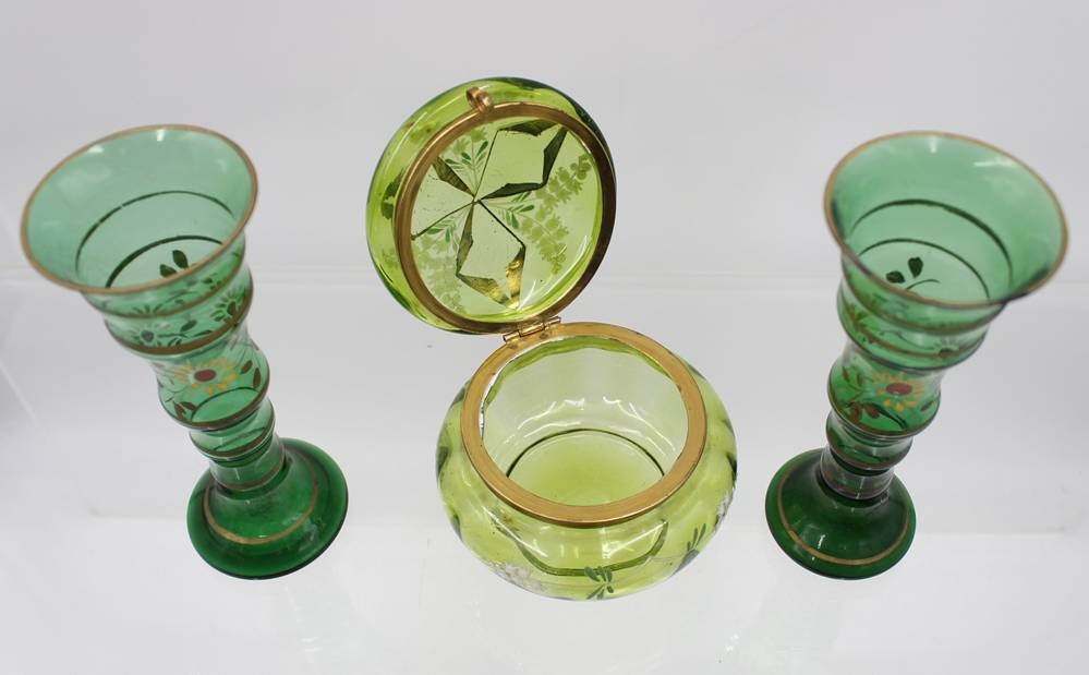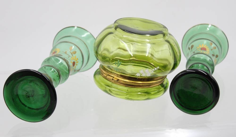 Dose mit Emaillebemalung um 1900 sowie Vasenpaar, grünes Glas, 1x Chip, Vasen H-16cm, Dose H-9,5cm D-10,5cm [1]