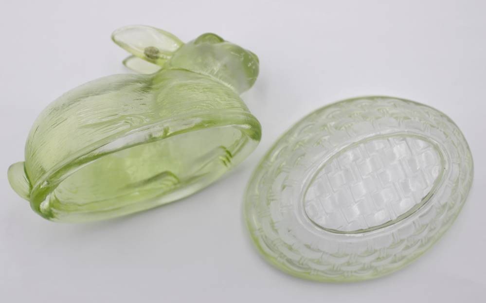 figürliche Dose, Hase, grünes Glas. H-10cm B-12cm. [1]