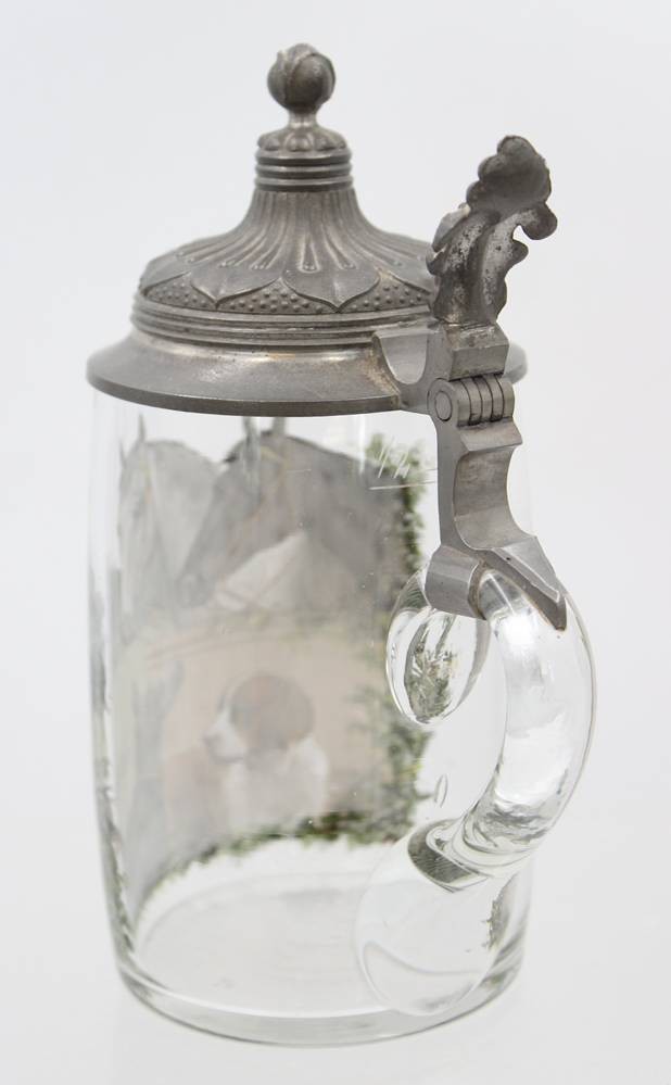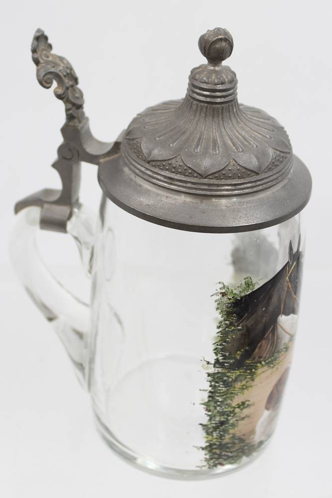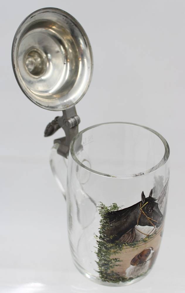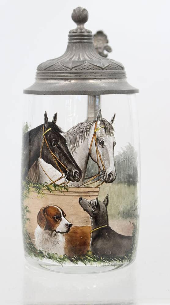 Glaskrug mit Zinndeckel, handbemalt mit Pferden und Hunden, um 1900, H-19 cm [1]