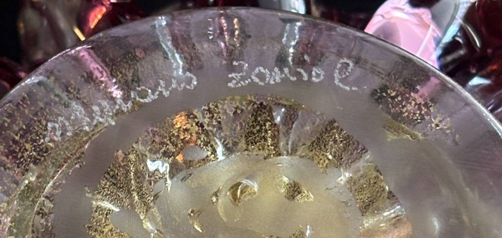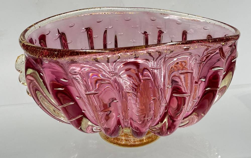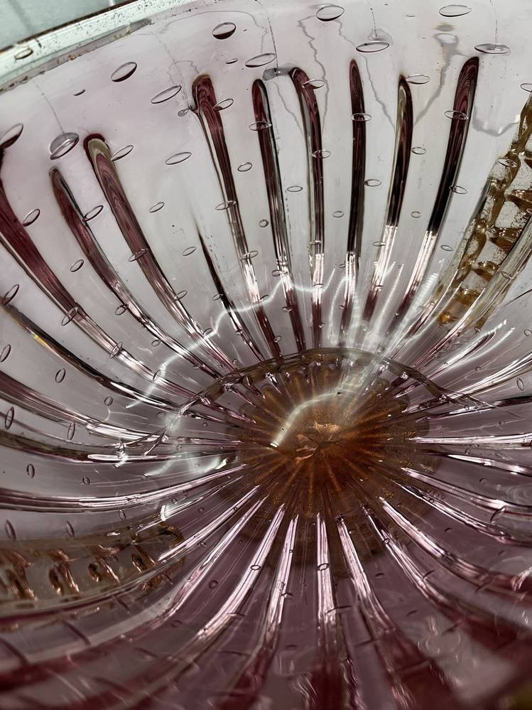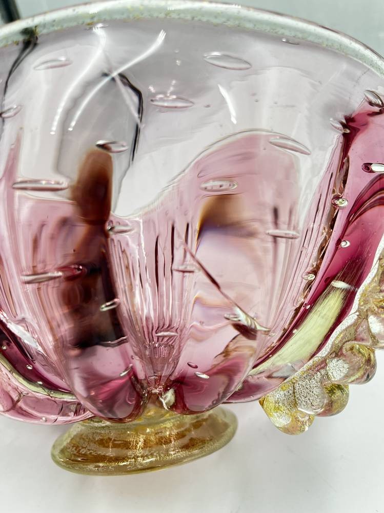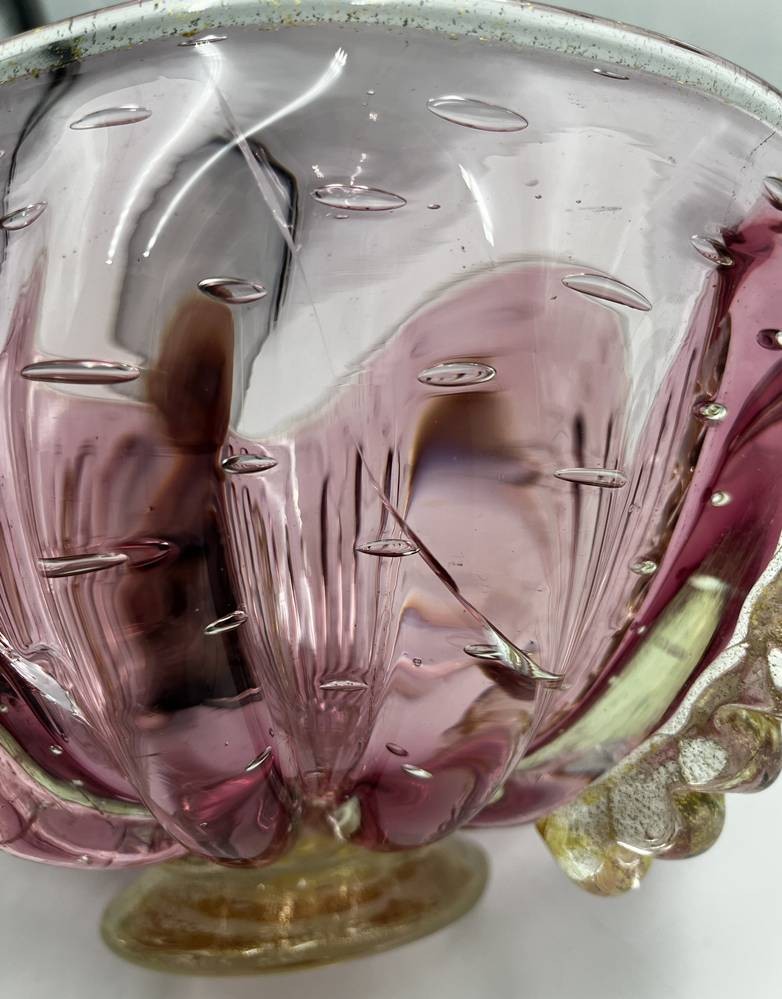 gr. Murano Schale auf Stand, signiert Murano ?, Spannungsrisse im Glas, Goldflitter, H-15 cm, D-25 cm, [1]