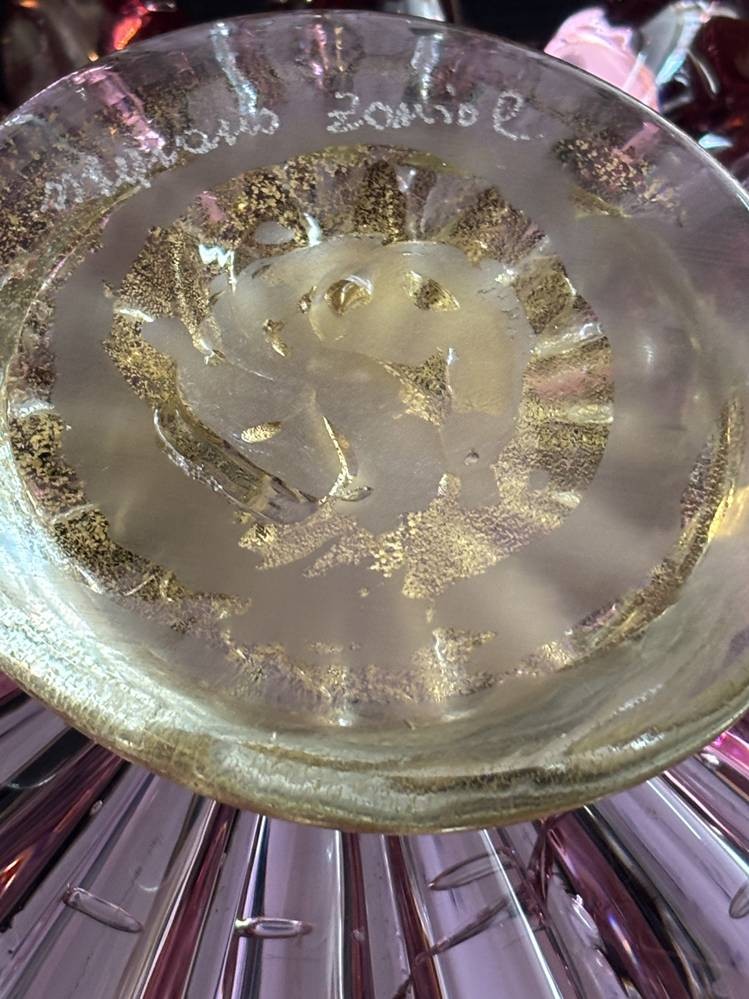 gr. Murano Schale auf Stand, signiert Murano ?, Spannungsrisse im Glas, Goldflitter, H-15 cm, D-25 cm,