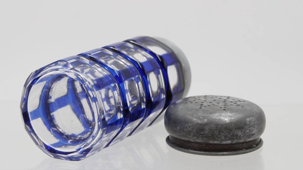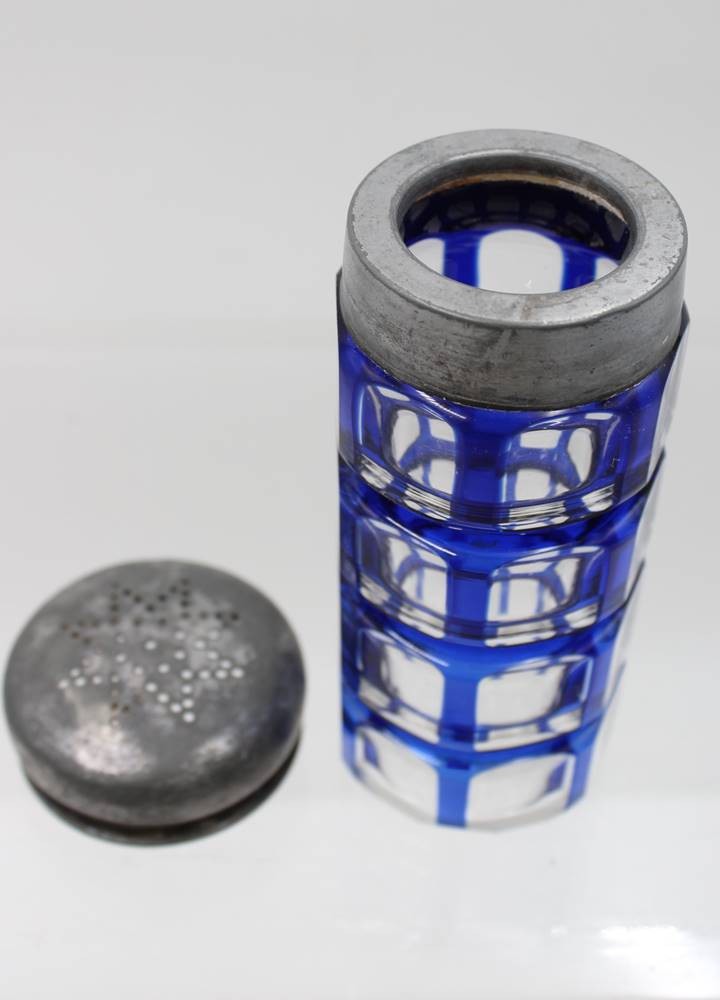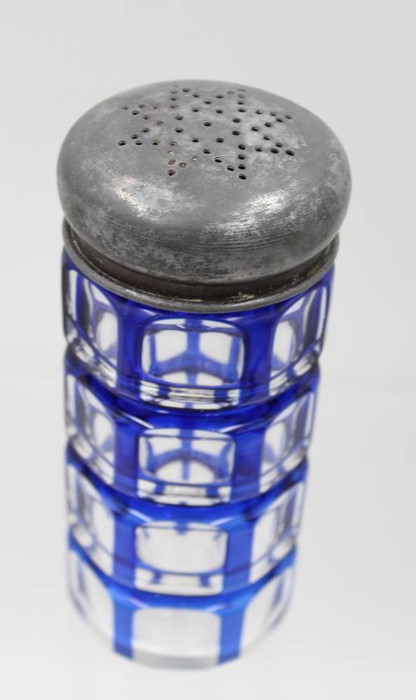 gr. Zuckerstreuer, wohl um 1920/30, blau überfangen, Josephinenhütte?, ca. H-14,5cm [1]