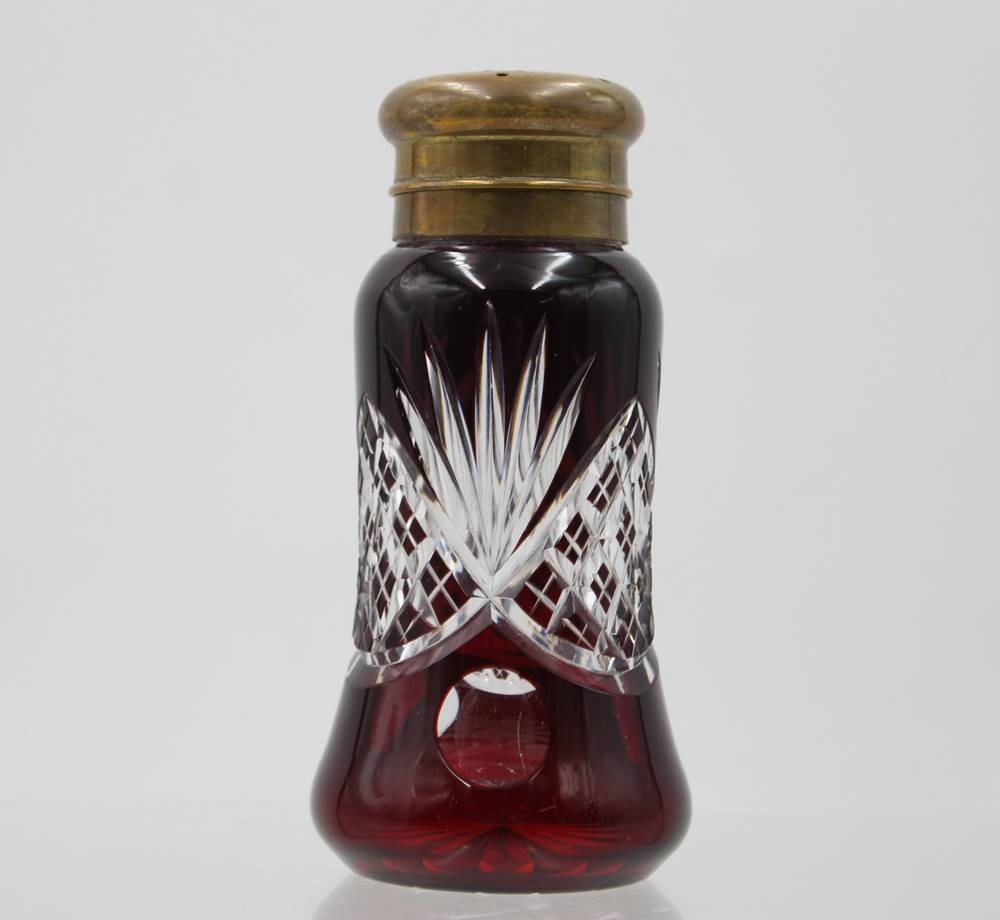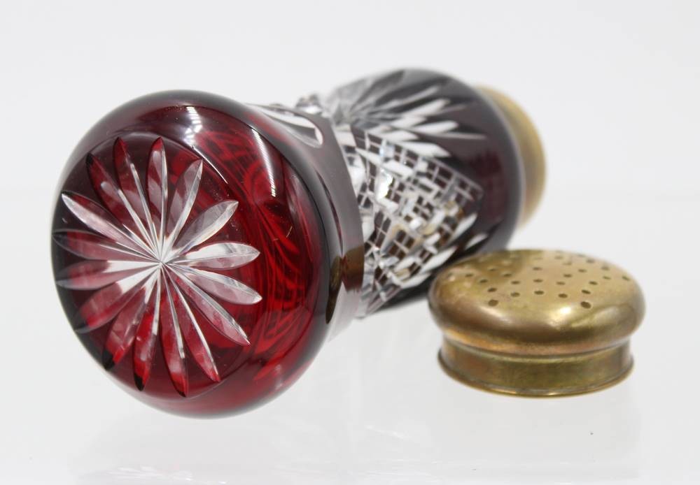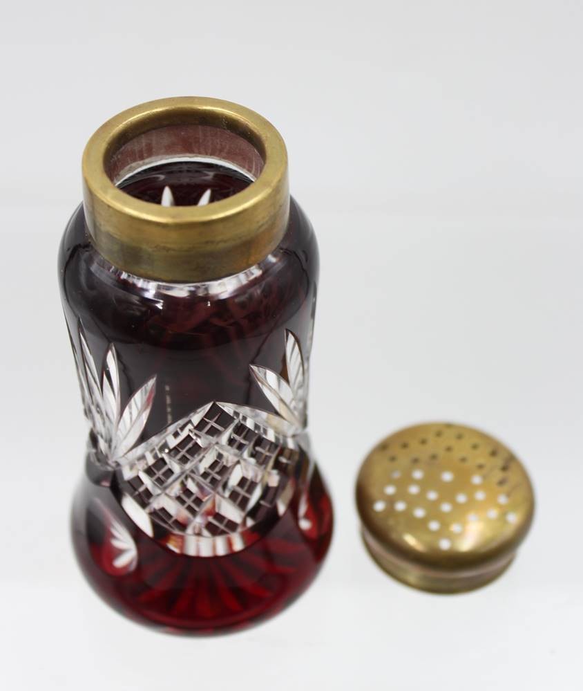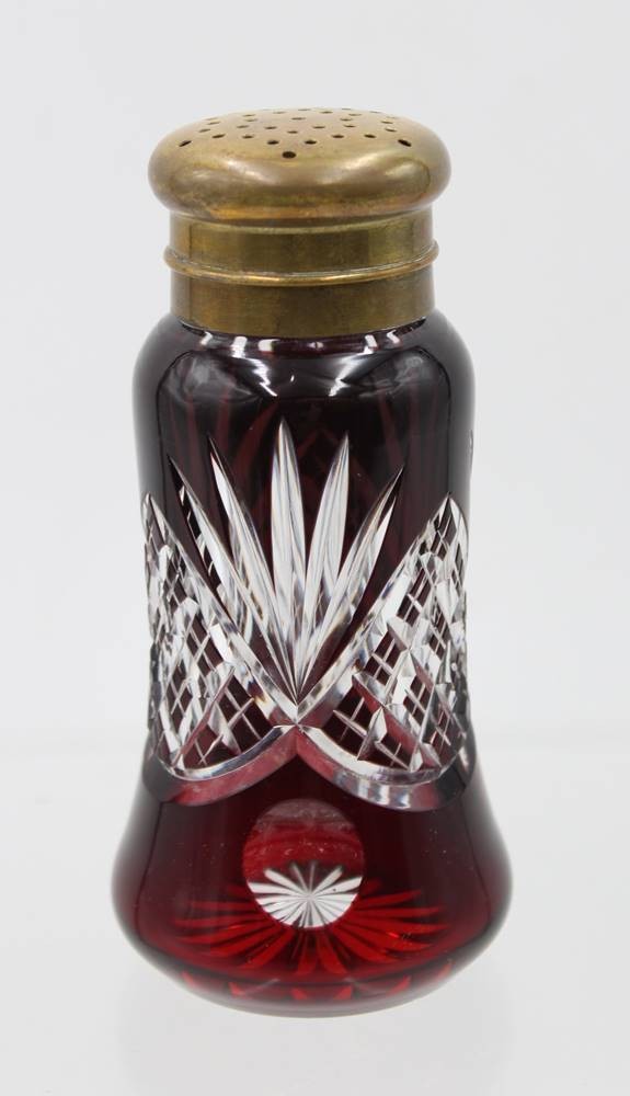 hoher Überfang-Streuer, Kristall, beschliffen, Josephinenhütte, Messingdeckel, ca. H-14cm [1]