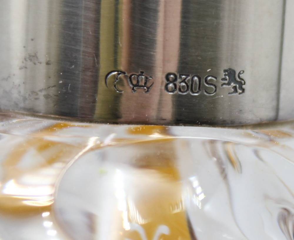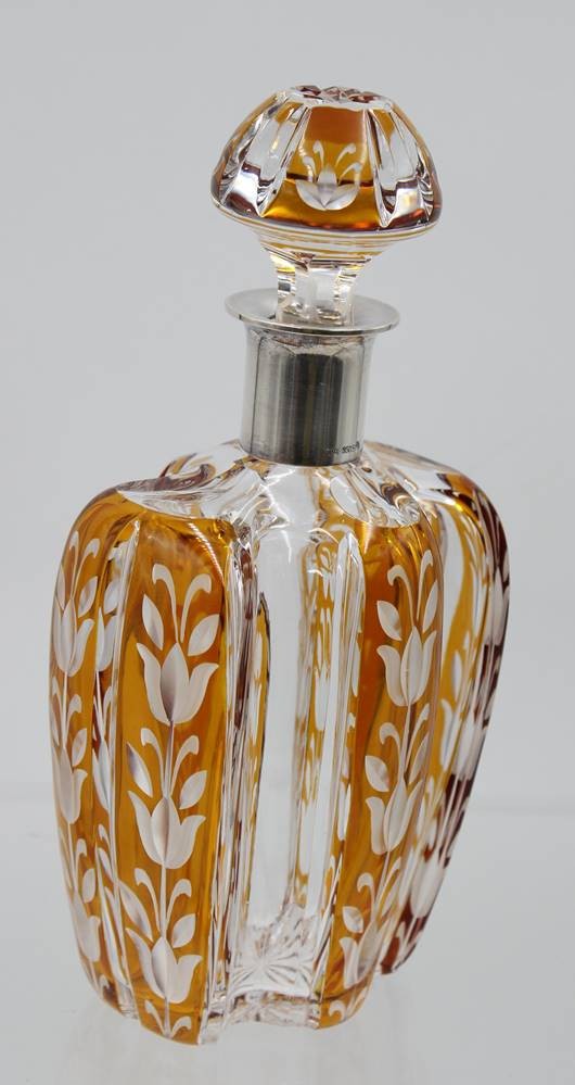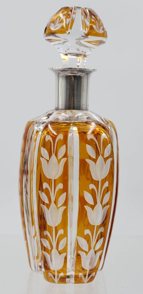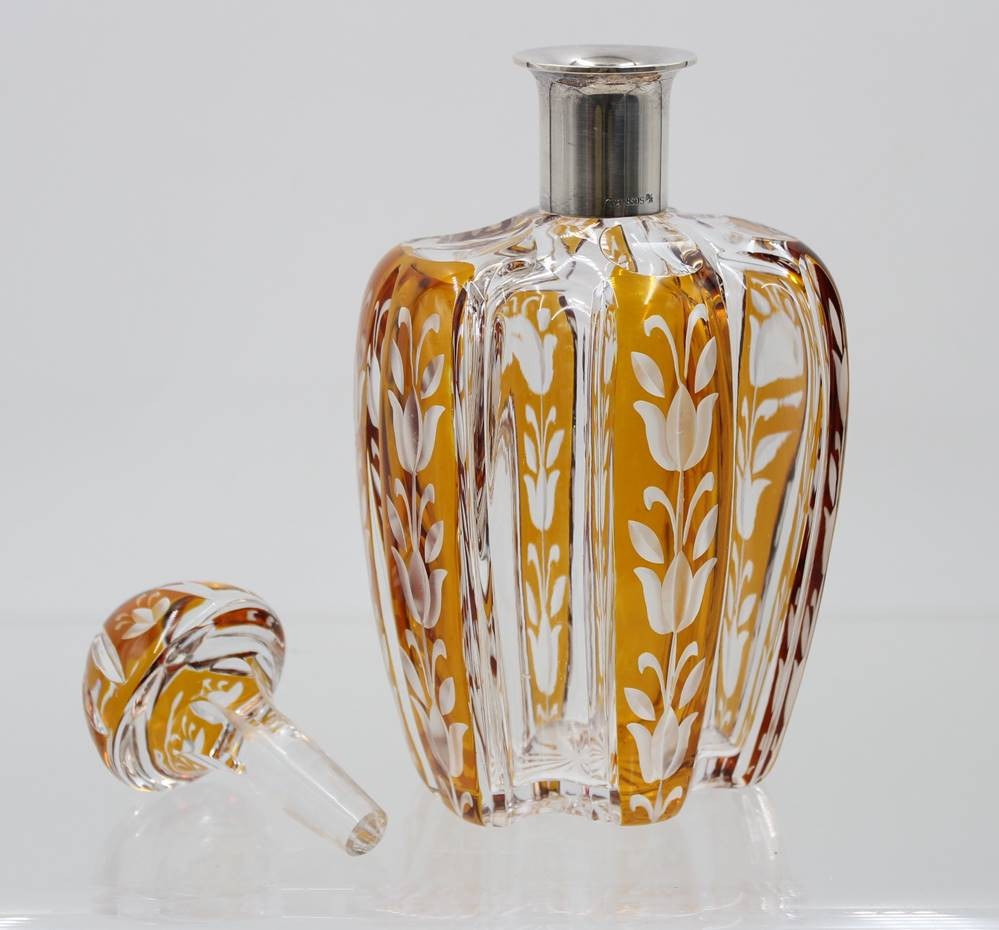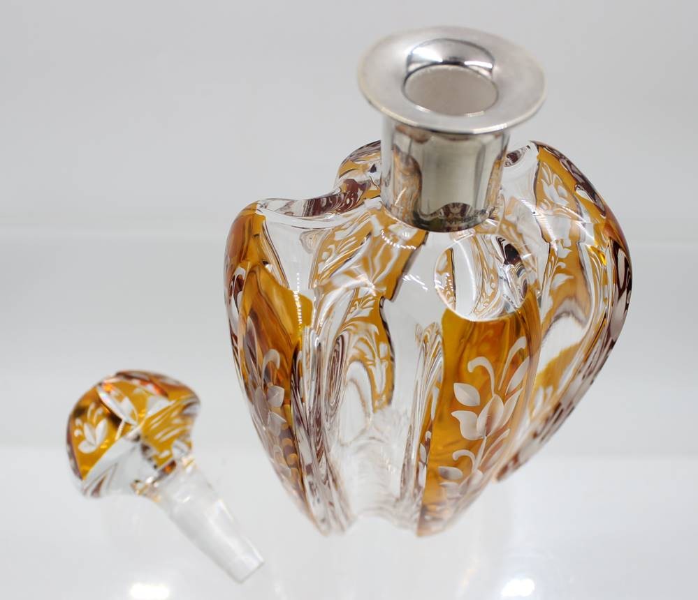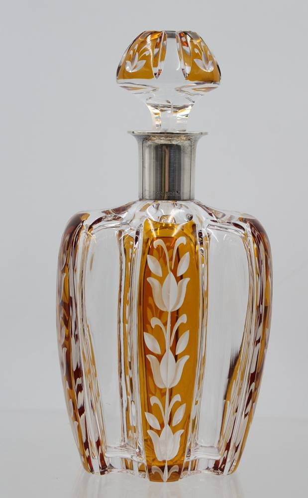 Kristall-Karaffe, bernsteinfarbener Überfang, 830er Silbermontur, ca. H-21,5cm [1]