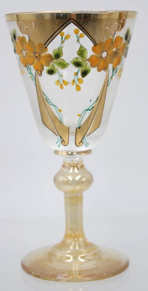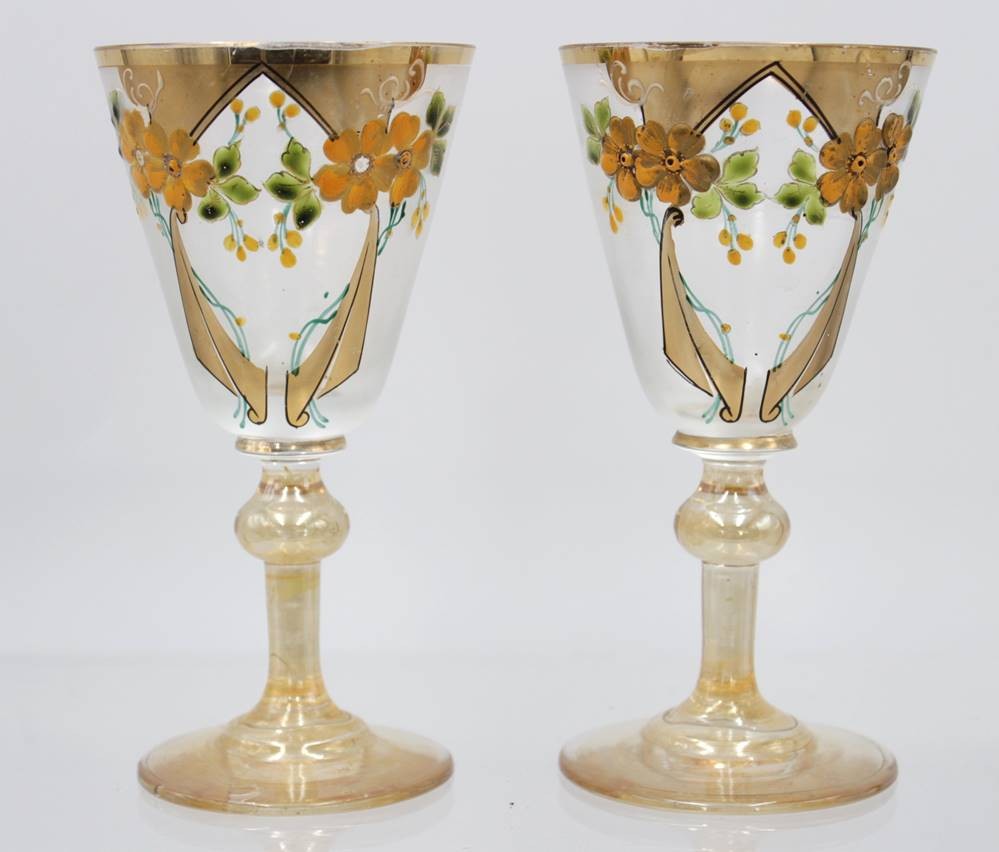 Paar alte Süssweingläser, florale Emaillemalerei, lüstrierend, ca. H-13,4cm, leicht berieben [1]