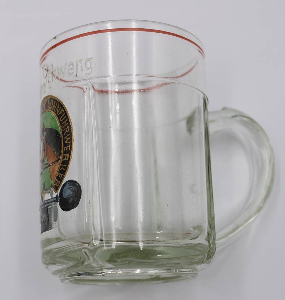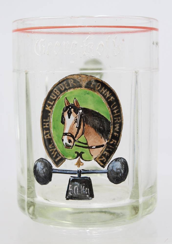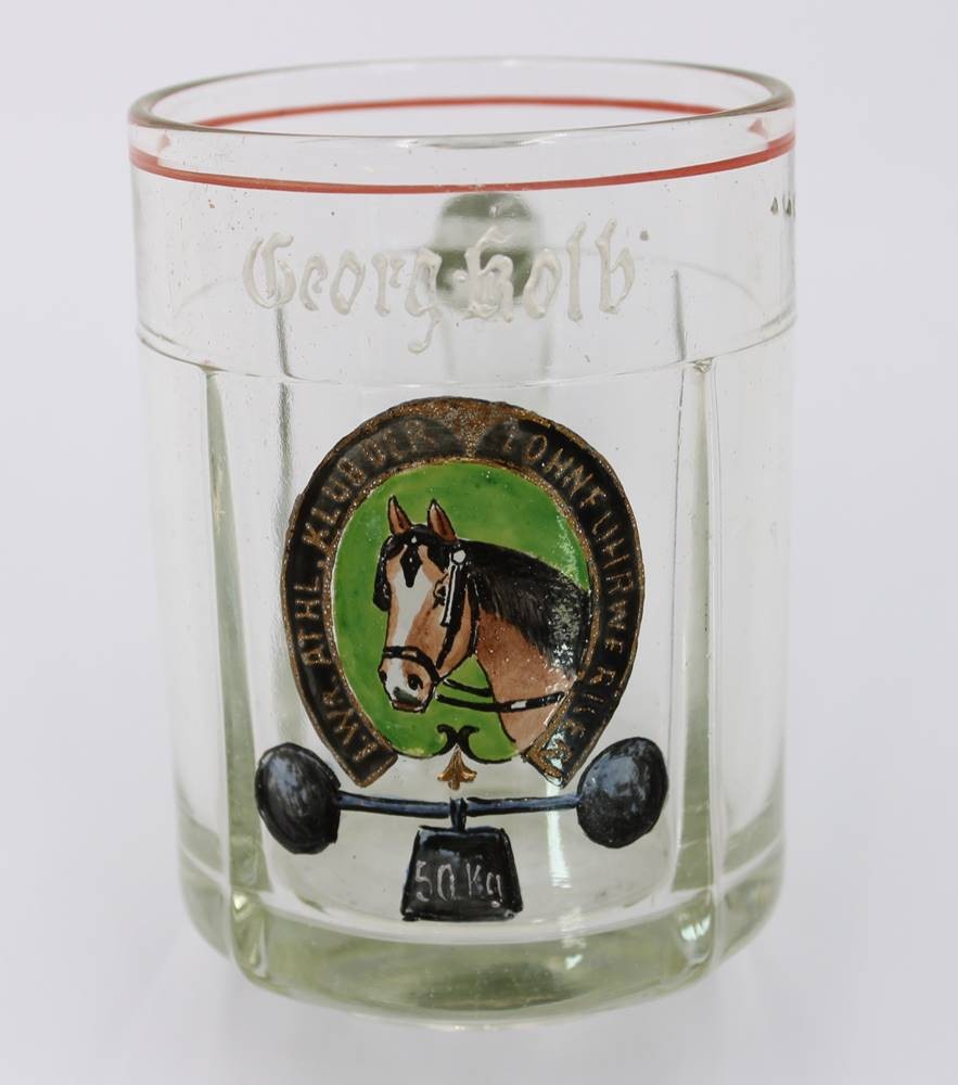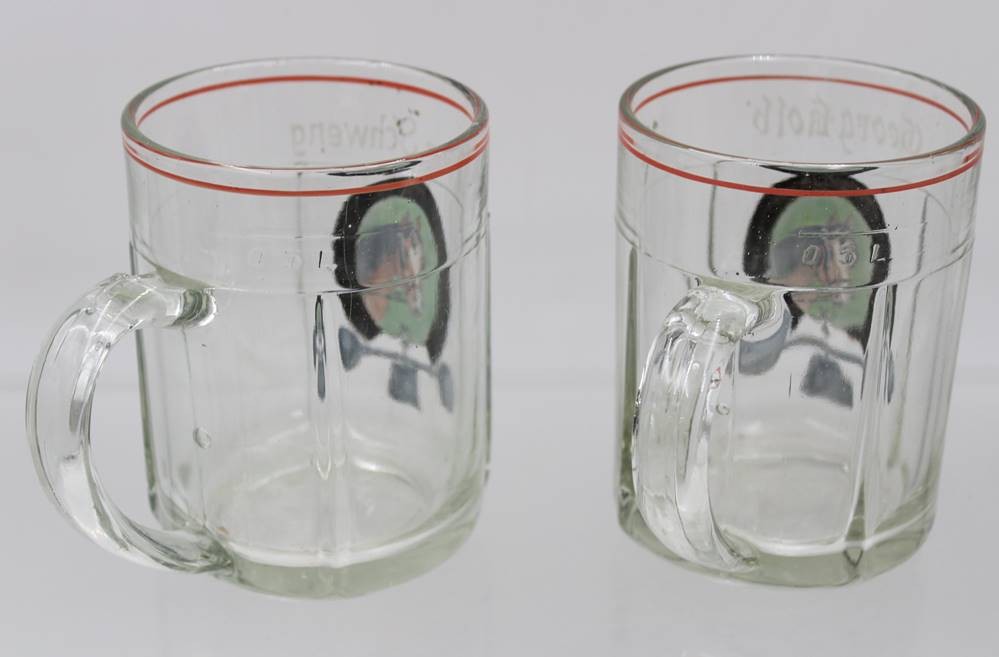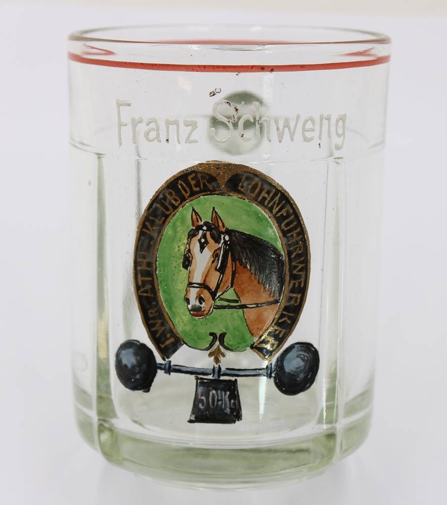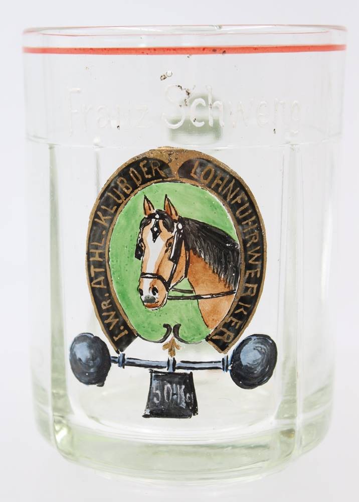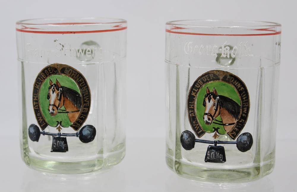 Paar Bierkrüge, älter, Emaillemalerei, beschriftet mit Namen und I. Wr. Athl. Klub der Lohnfuhrwerker, ca. H-12,5cm [1]