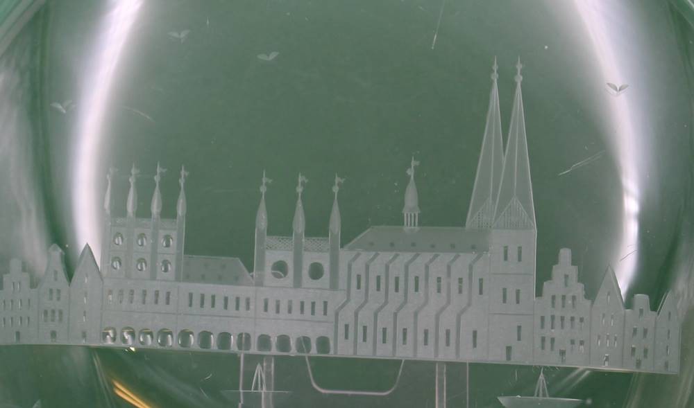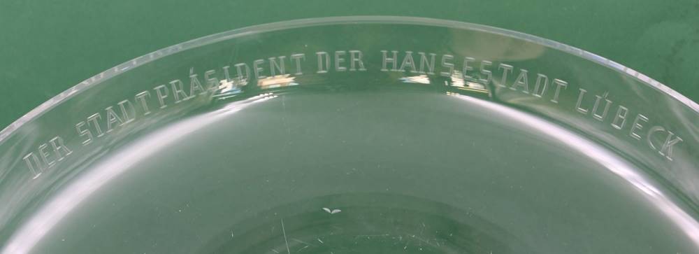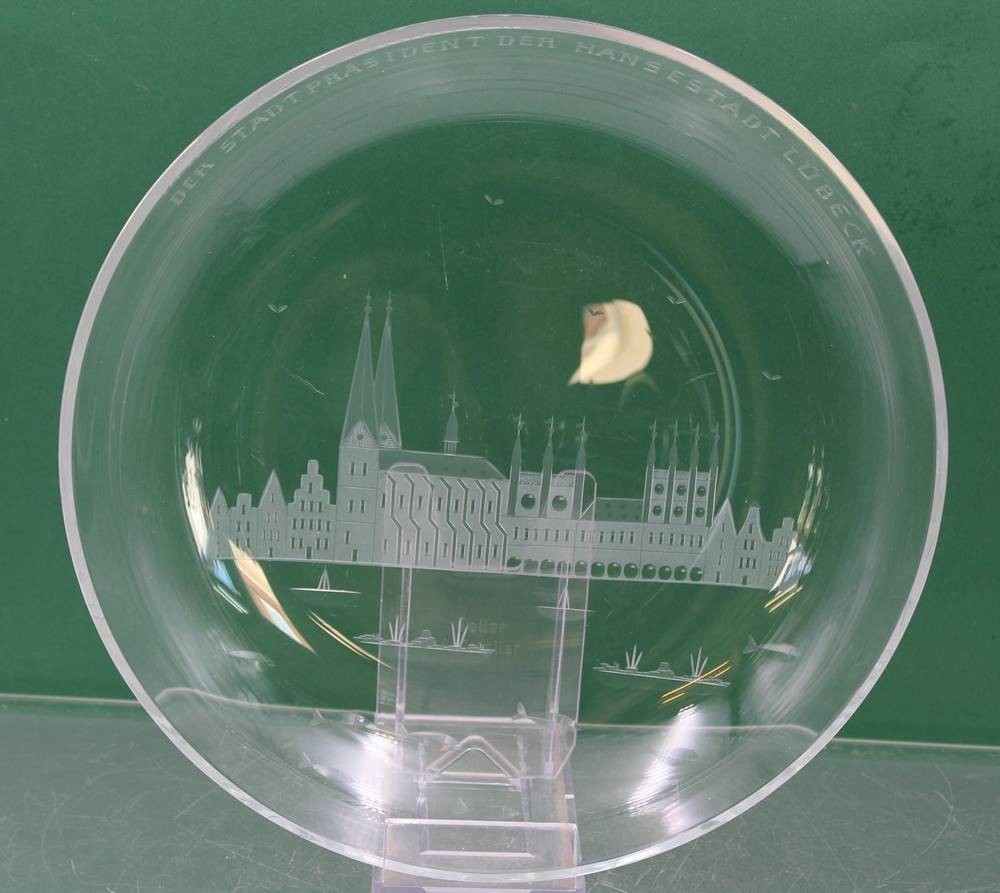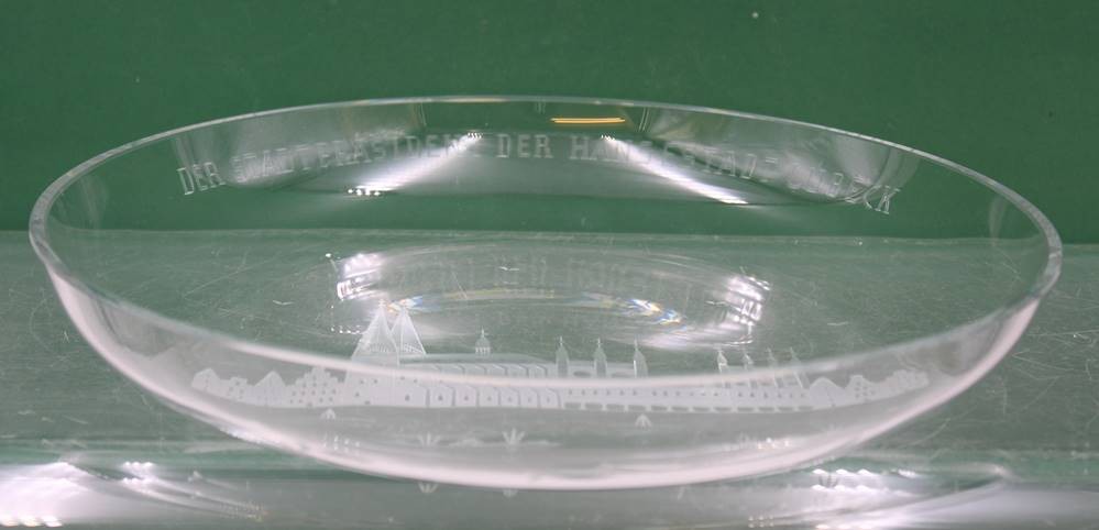 Schale mit Ansicht Lübeck, beschriftet"DER STADT PRÄSIDENT DER HANSESTADT LÜBECK", ca. H-4,5cm D-28cm [1]