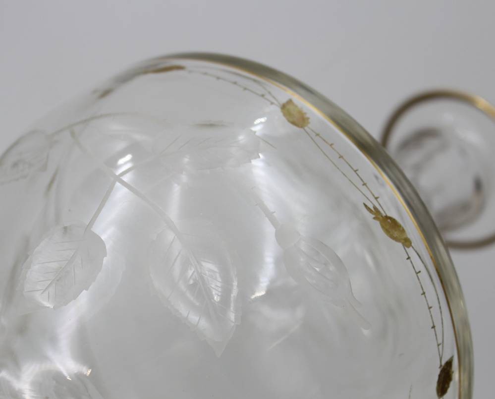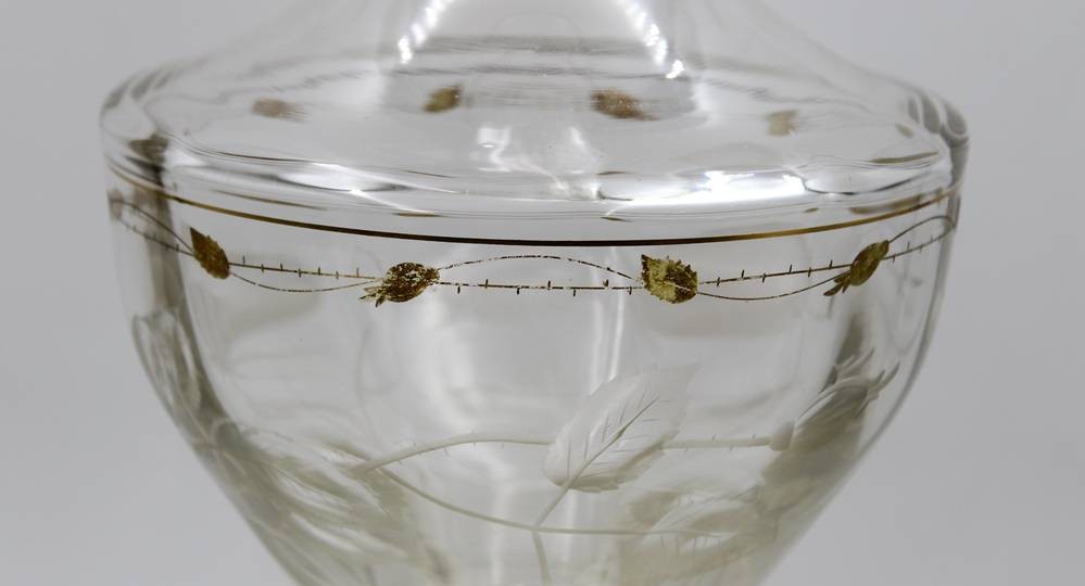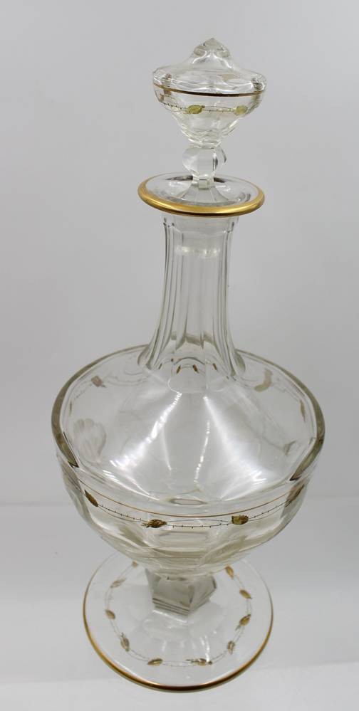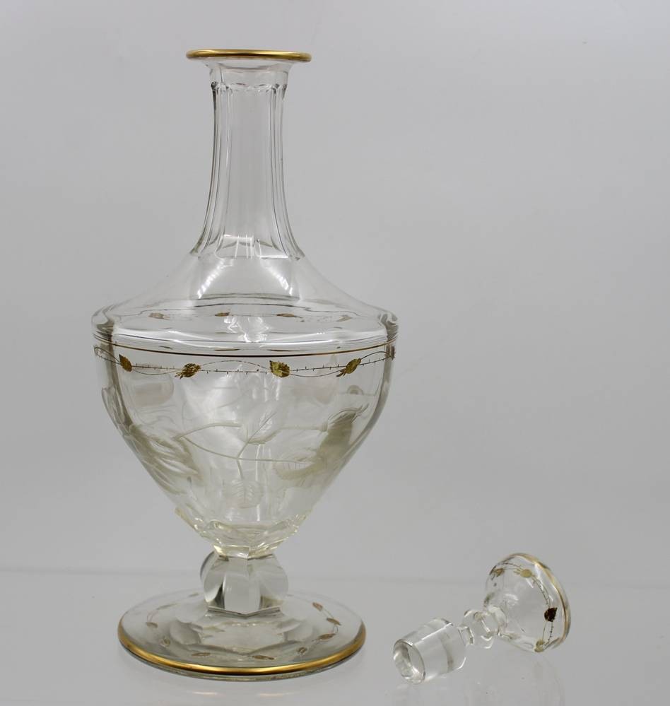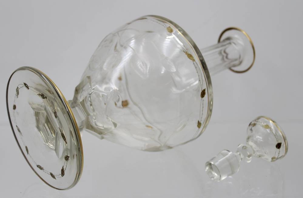 schöne Karaffe, Moser, Karlsbad, Serie Paula, 20.Jhd., farbloses Glas, geschliffen und geschnitten, Goldstaffage, leicht berieben, ca. H-35cm [1]